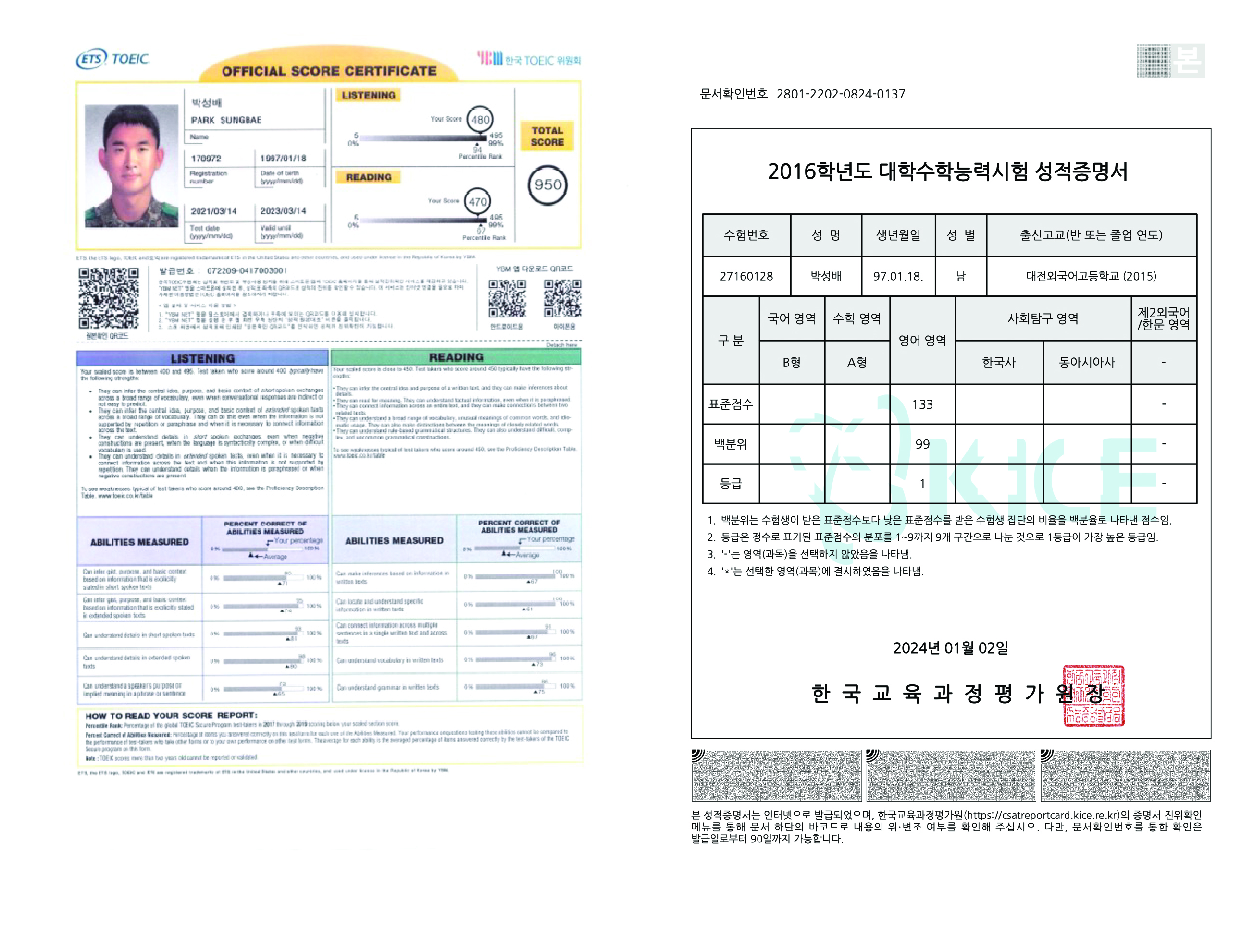 토익은 2021년도에, 수능은 2015년도에 응시하였다.