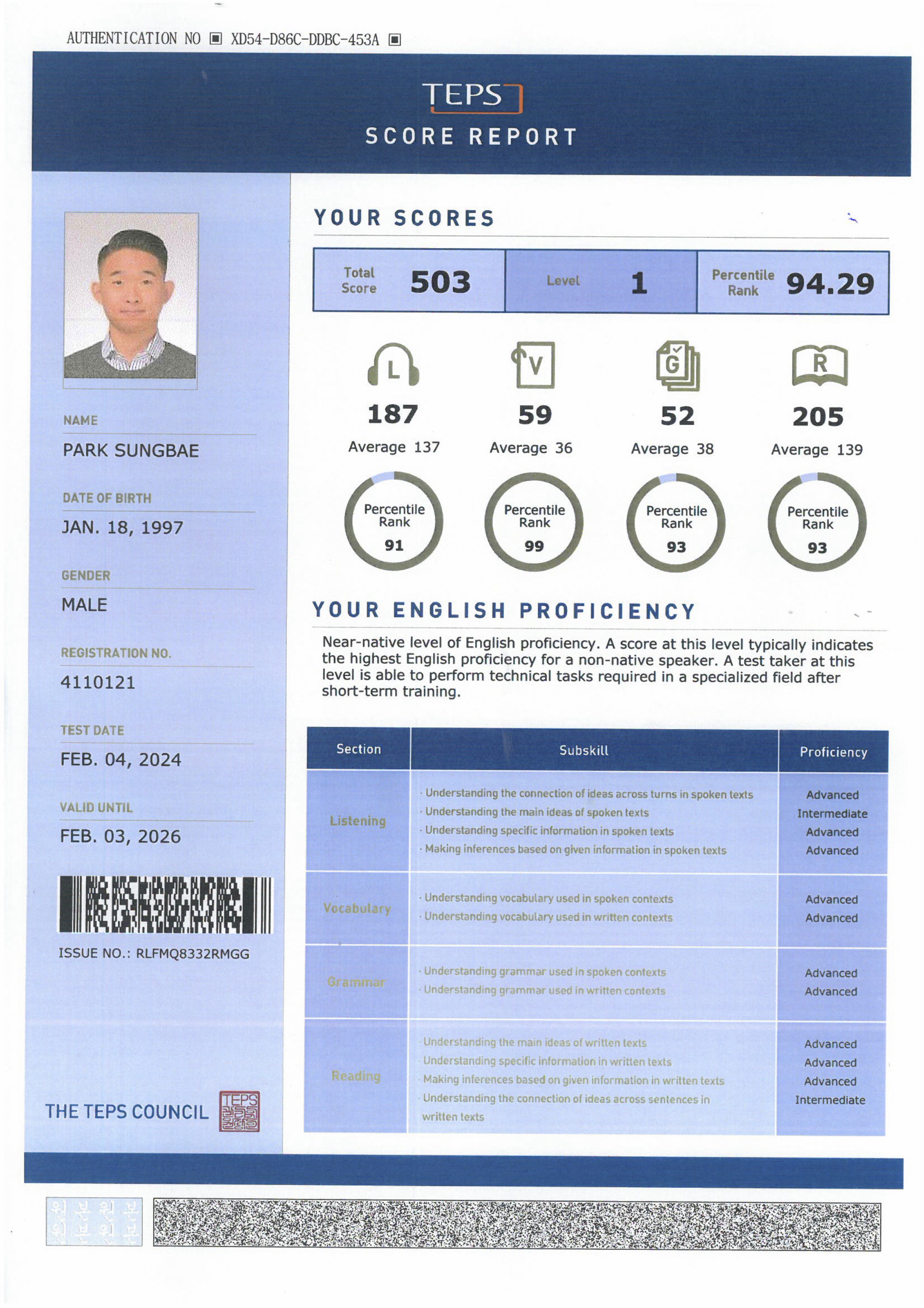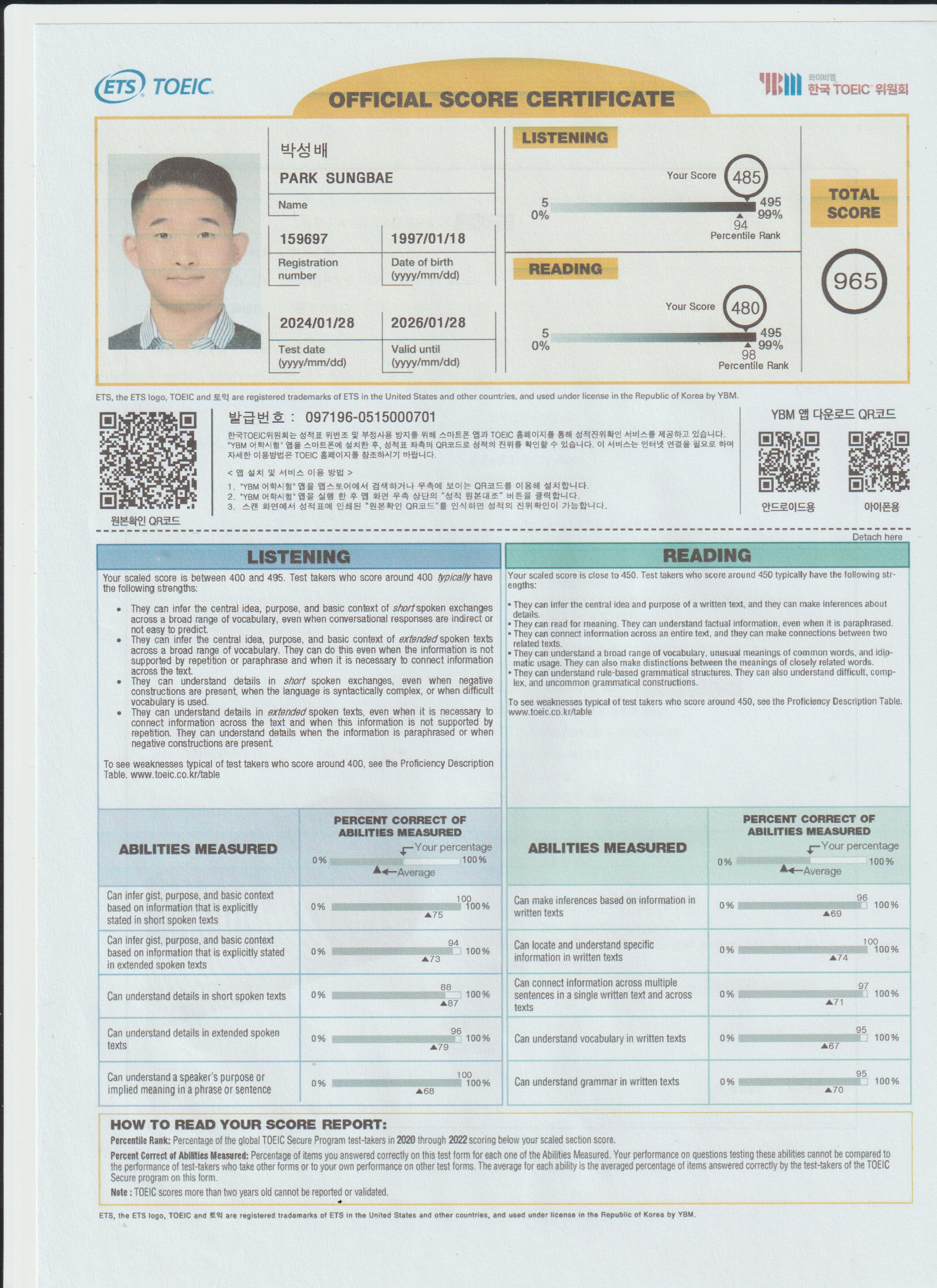 최근에는 토익 965점과 텝스 503점을 얻었다.