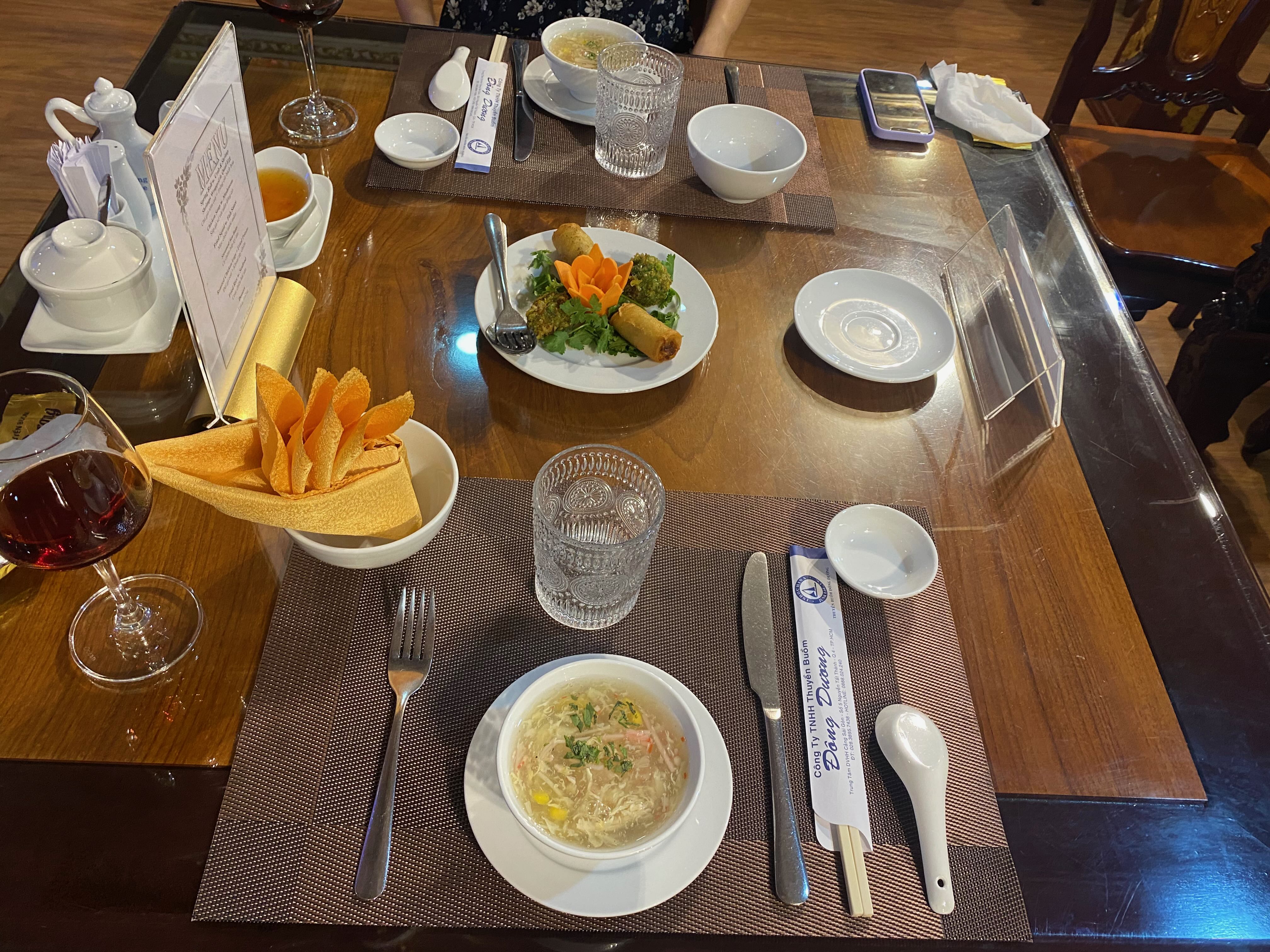 돌아다니다가 더워서 다시 자리로 돌아와보니 첫 메뉴가 먼저 나와 있었다. 게살 스프와 분짜였던 것 같다.