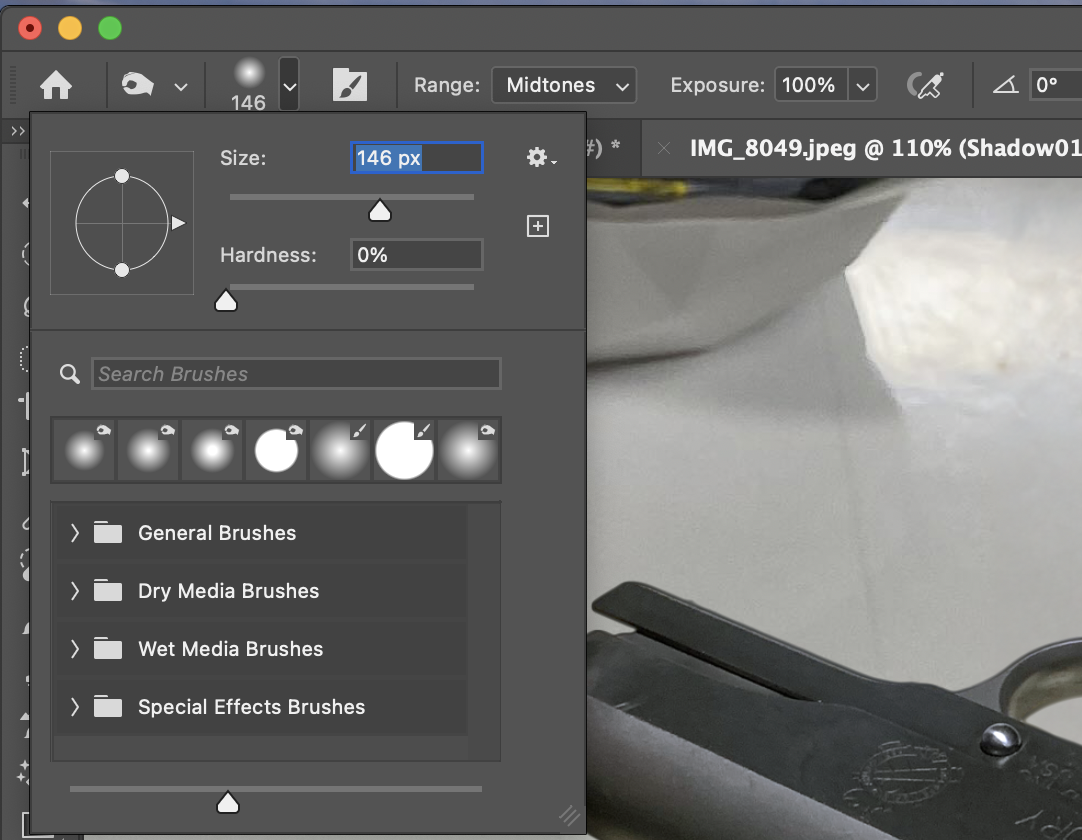 Burn tool도 붓처럼 적용하는 것이기 때문에 붓 크기와 강도 적용이 가능하다. 위는 강도를 30% 정도 했을 떄