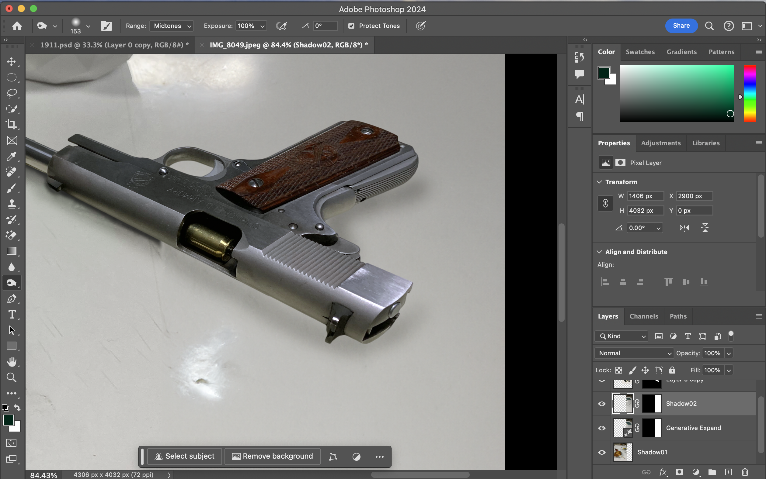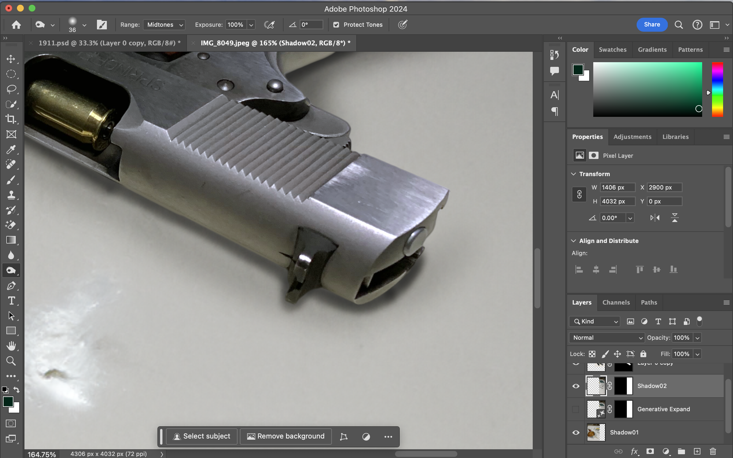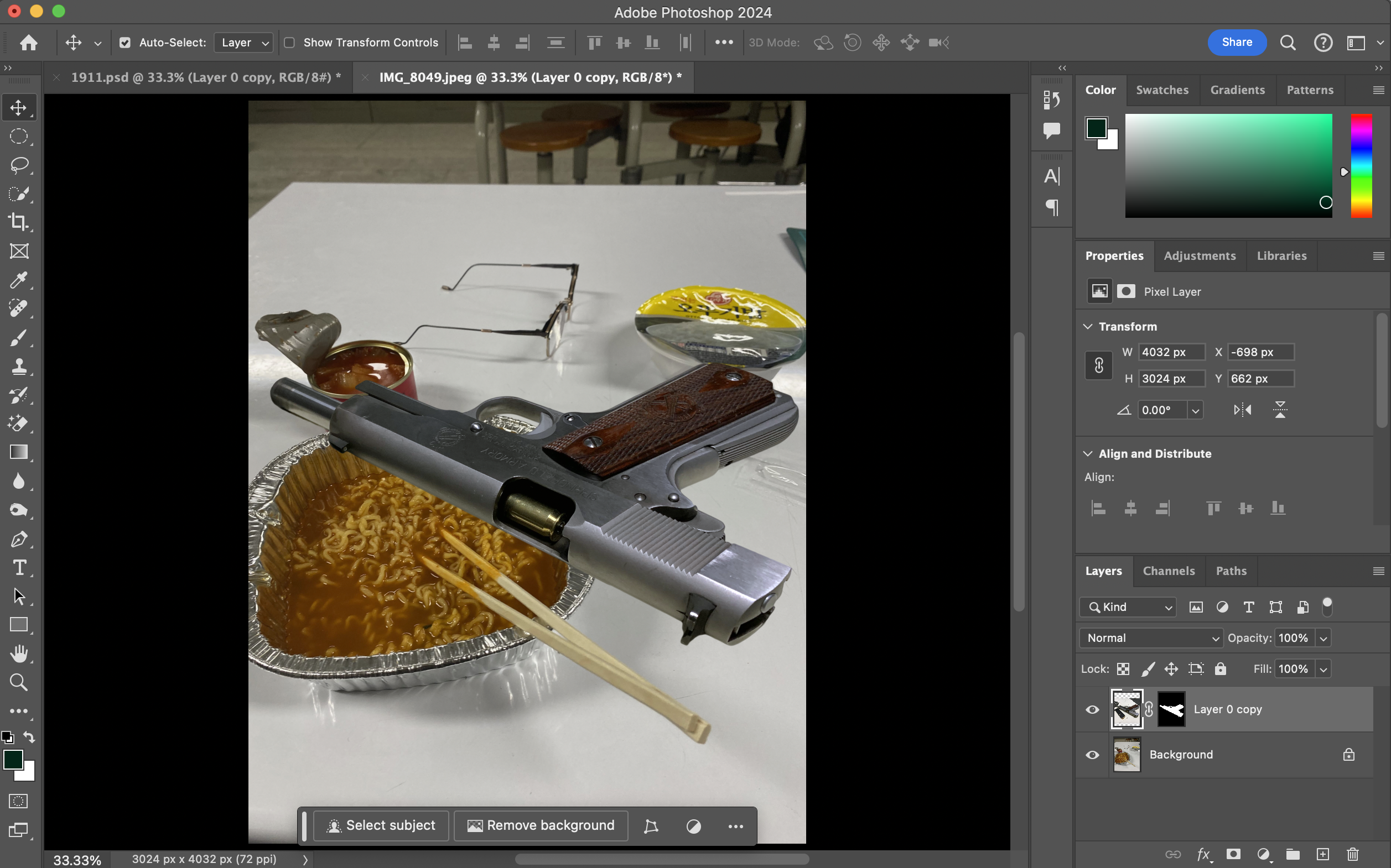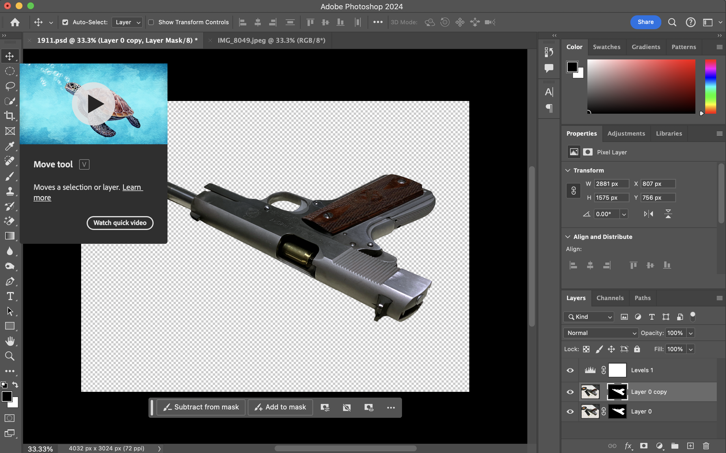 지난번에 배경을 제거했던 총을 사진에 붙여 넣기 위해서는 Move tool(단축키 V)를 눌러서 총을 드래그하여 옮겨 넣을 수 있다.