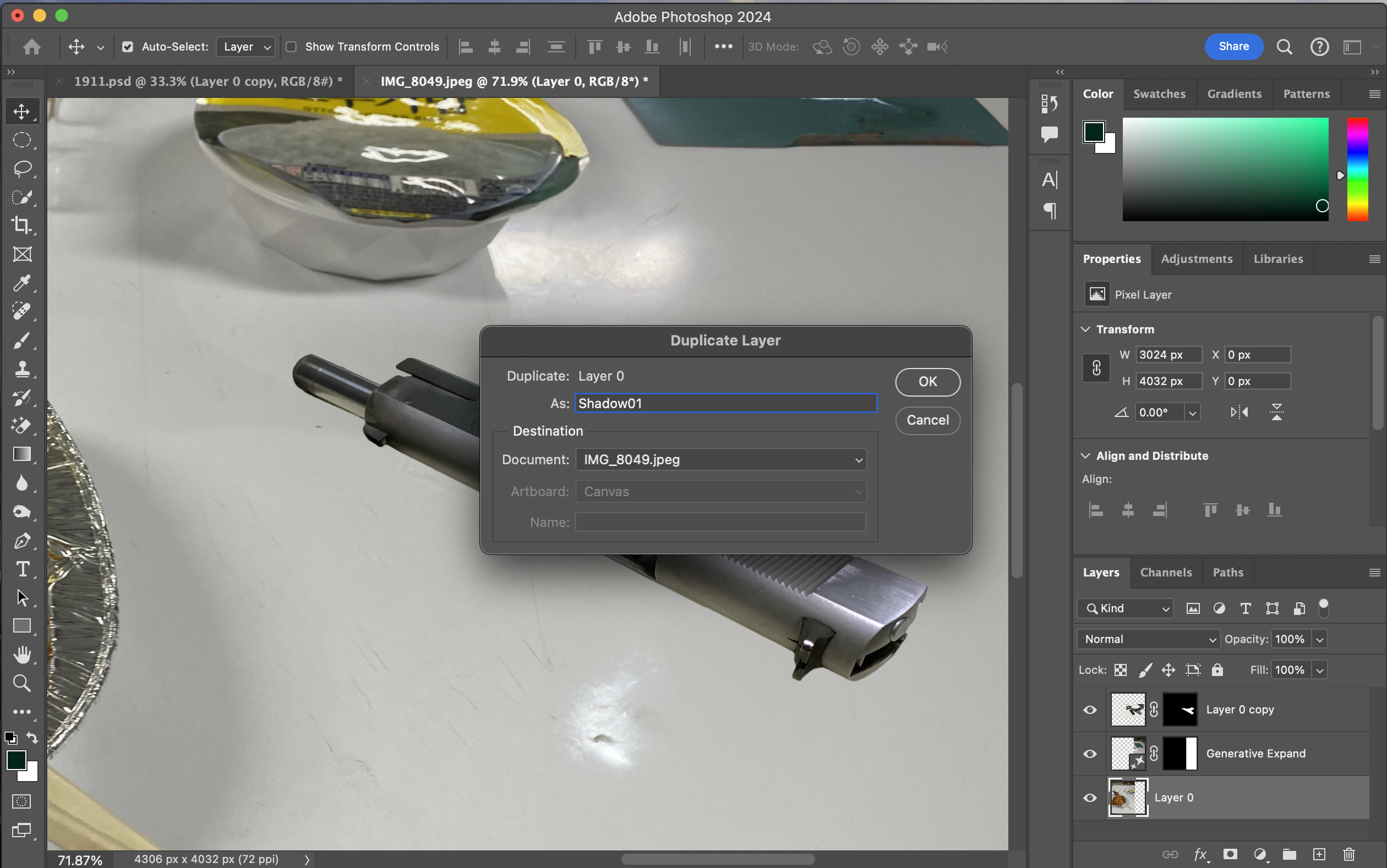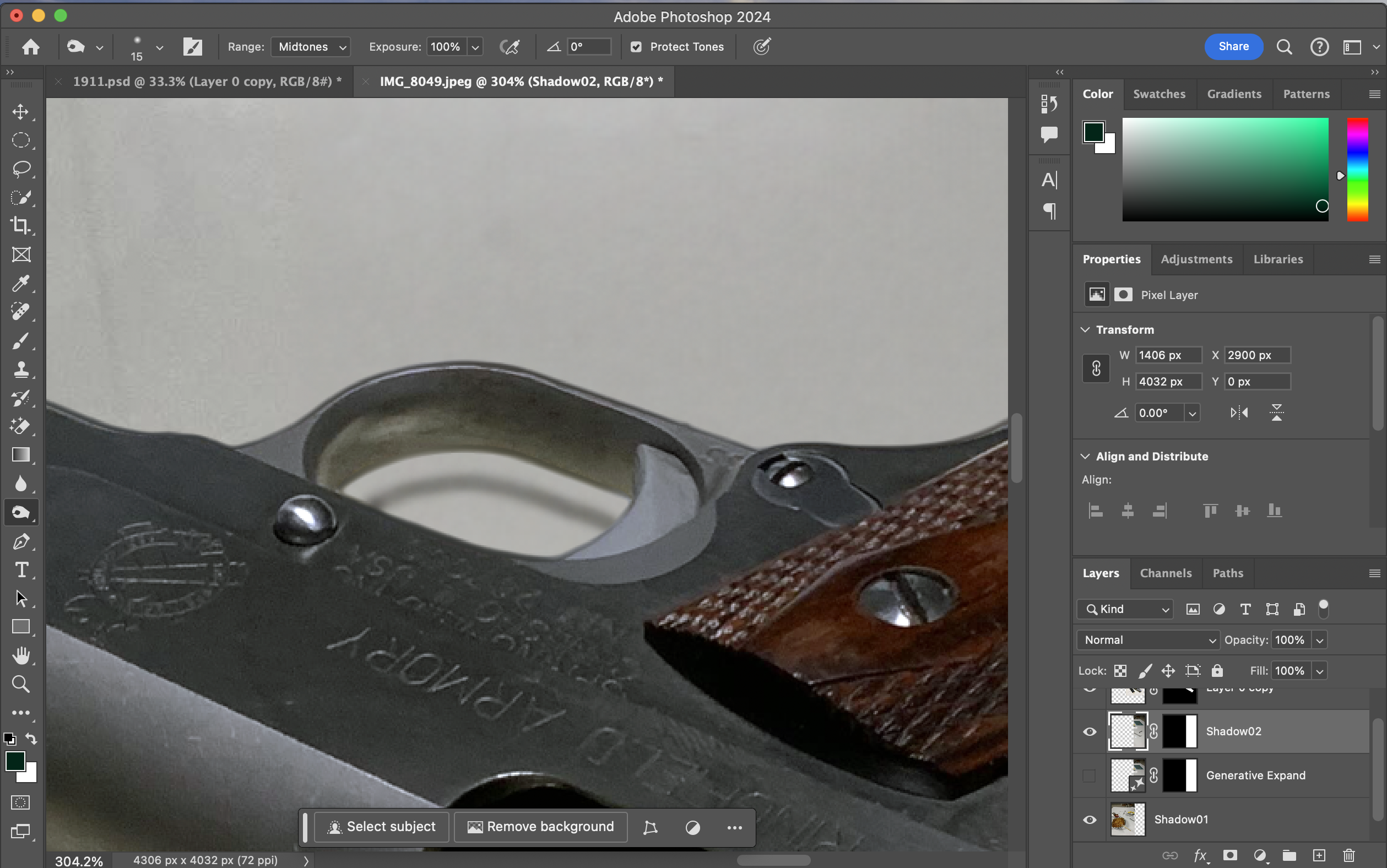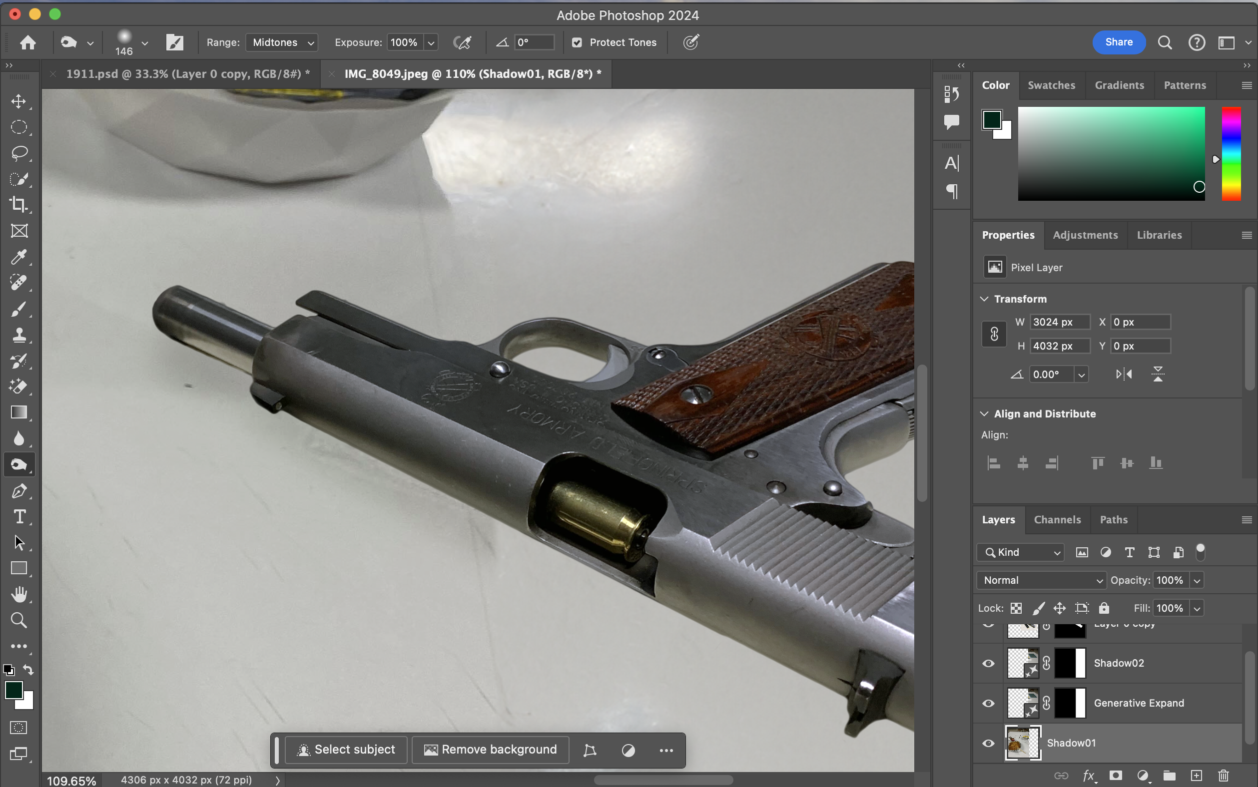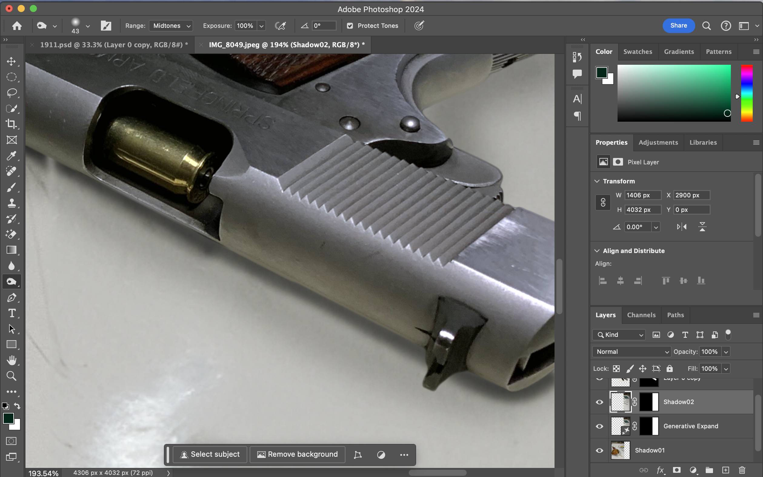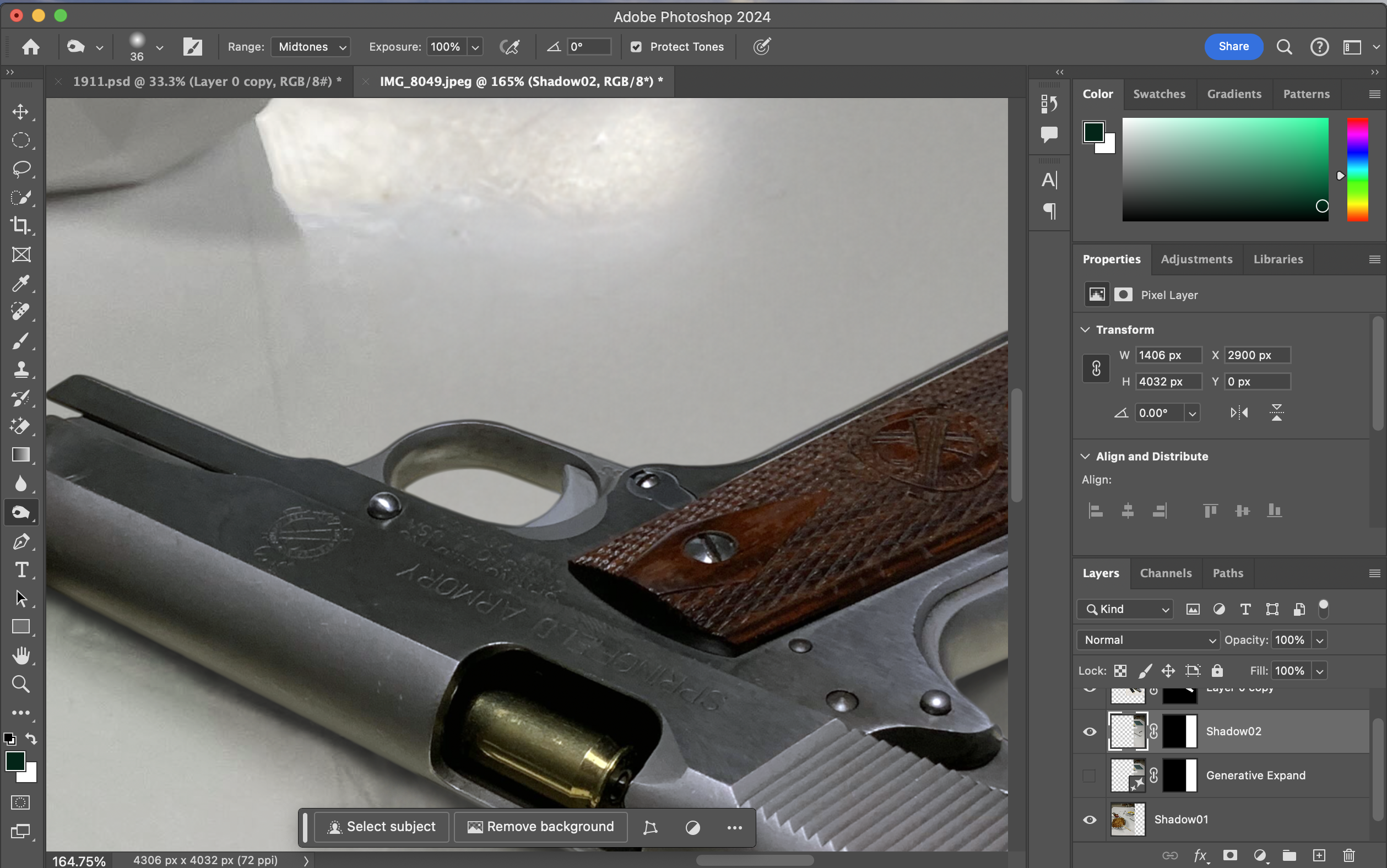 지난번에 배경을 제거했던 총을 사진에 붙여 넣기 위해서는 Move tool(단축키 V)를 눌러서 총을 드래그하여 옮겨 넣을 수 있다.
