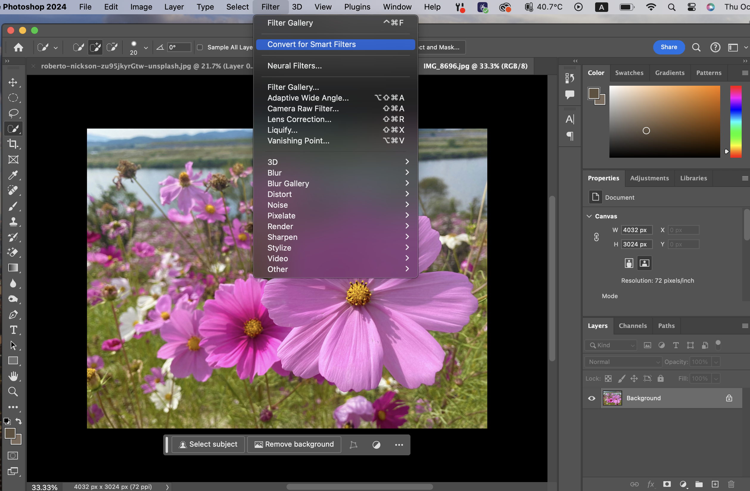위 사진에서처럼 맨 위에 Filter 창을 열면 위에서 2번째에 'Convert for Smart Filters'라고 나온 부분이 있다.