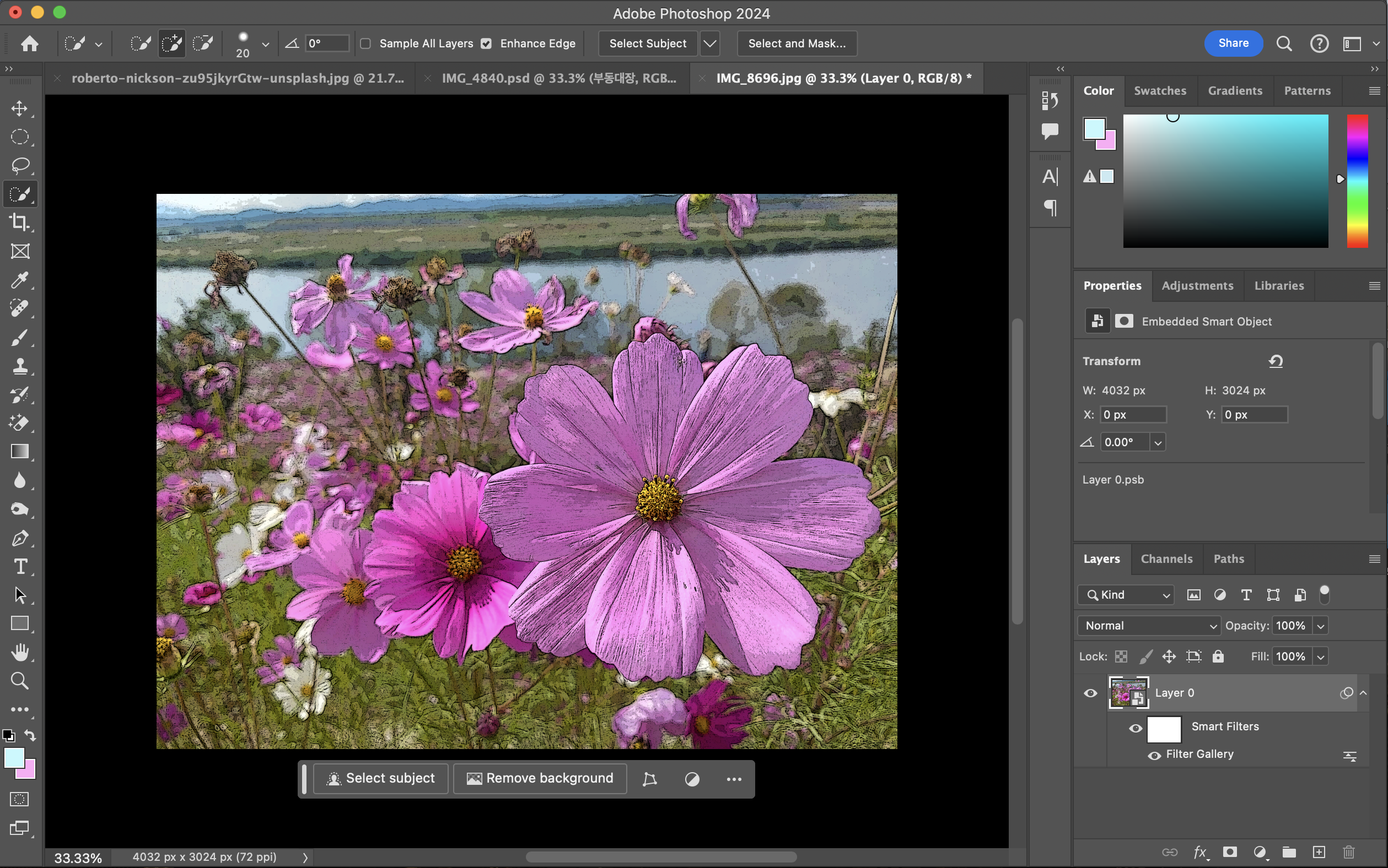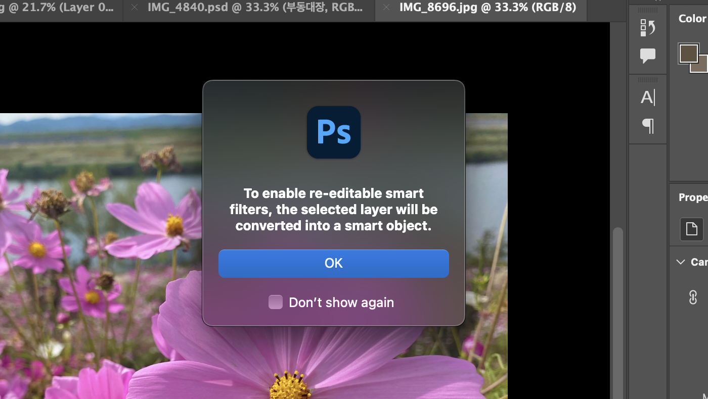 그렇기 때문에 필터를 적용하기 전에 스마트 필터를 레이어에 꼭 적용하는 것이 좋다.