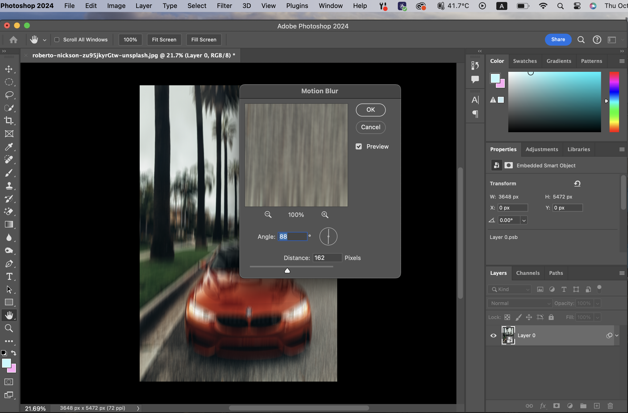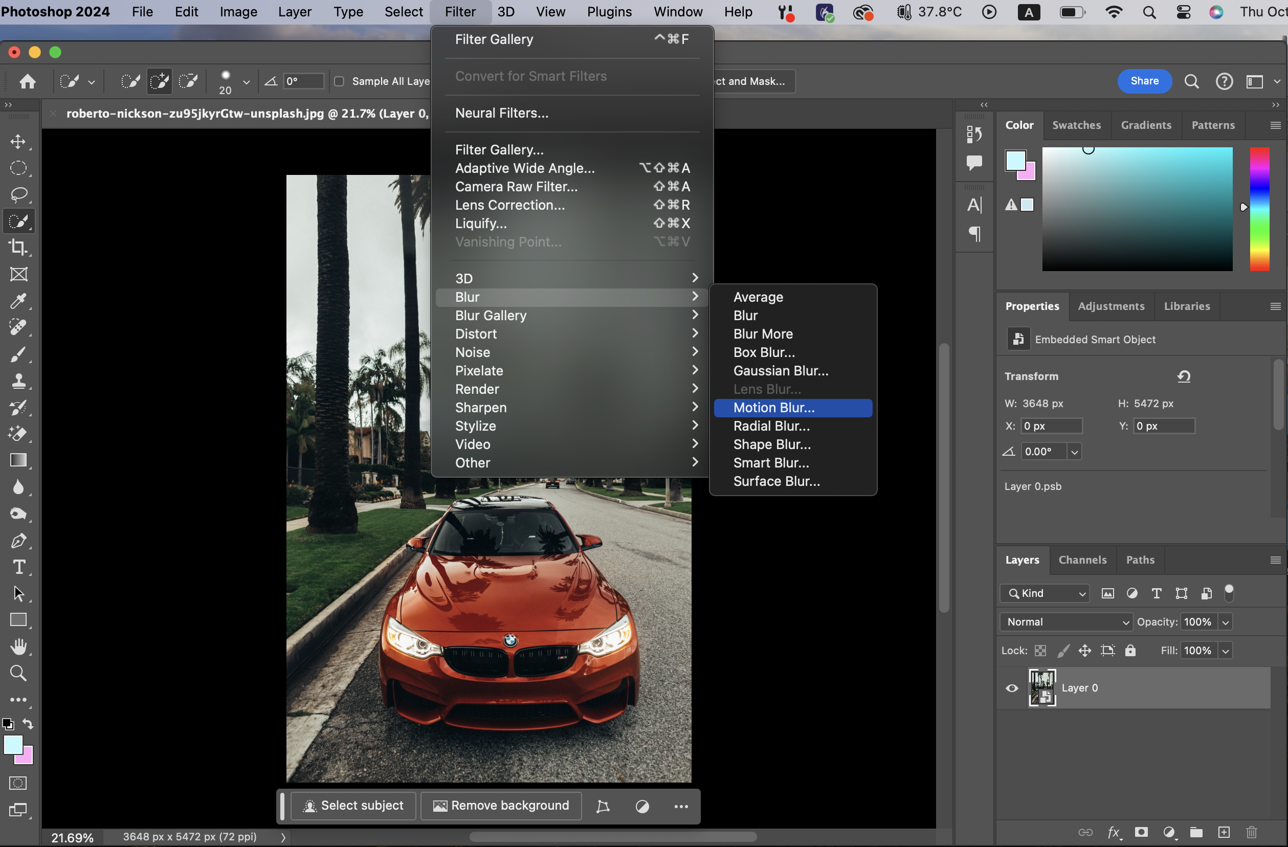 스마트 필터를 적용하고 난 뒤에는 Filter - blur - motion blur를 적용하면 된다.