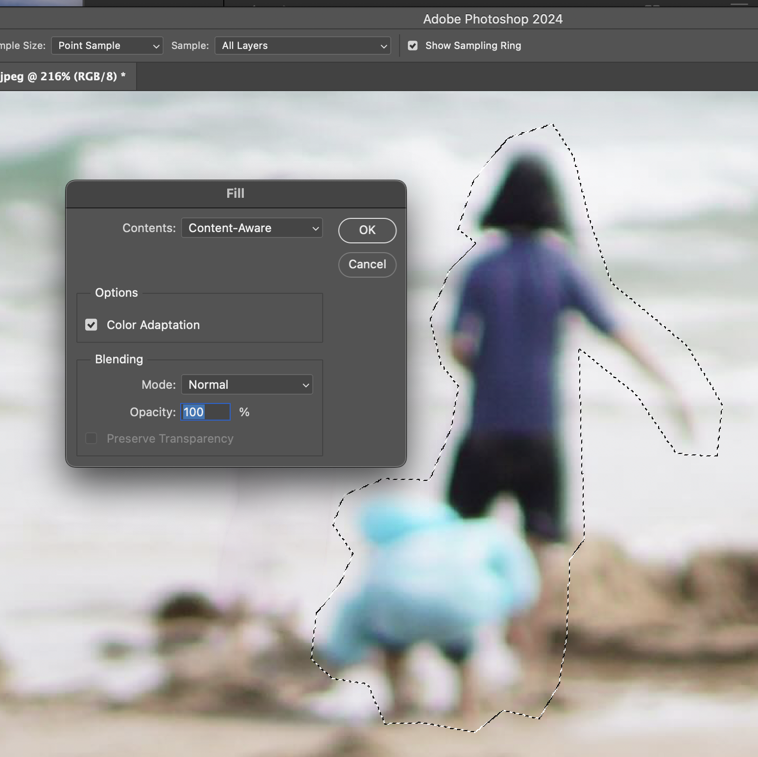 그러면 위 사진과 같이 창이 뜨는데, Content를 'Content-Aware'로 설정해준다. 그렇게 OK를 누르면