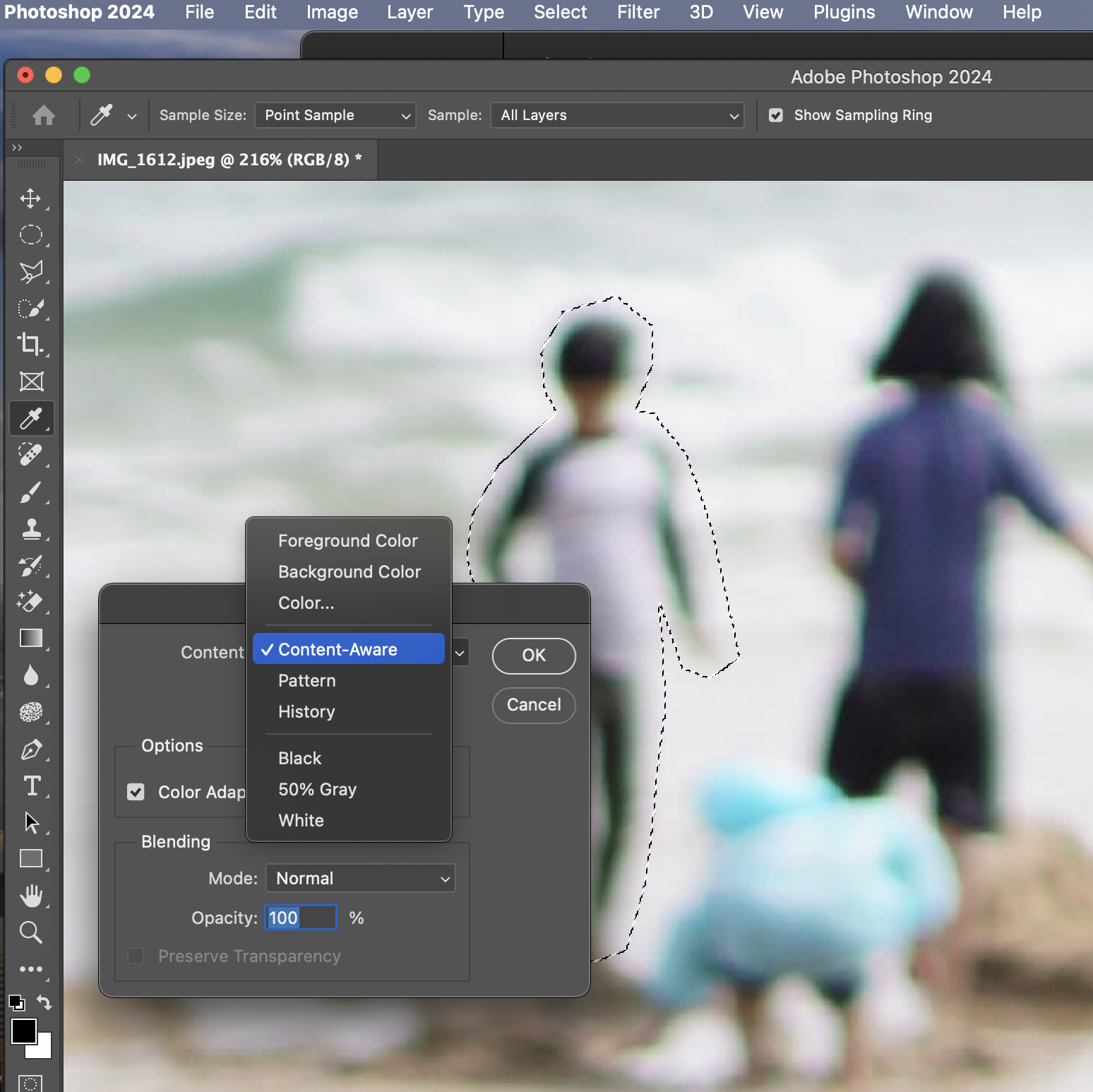 Edit-Fill을 통해서 저 창이 나오도록 한 다음, Content를 Content-Aware로 바꾸면