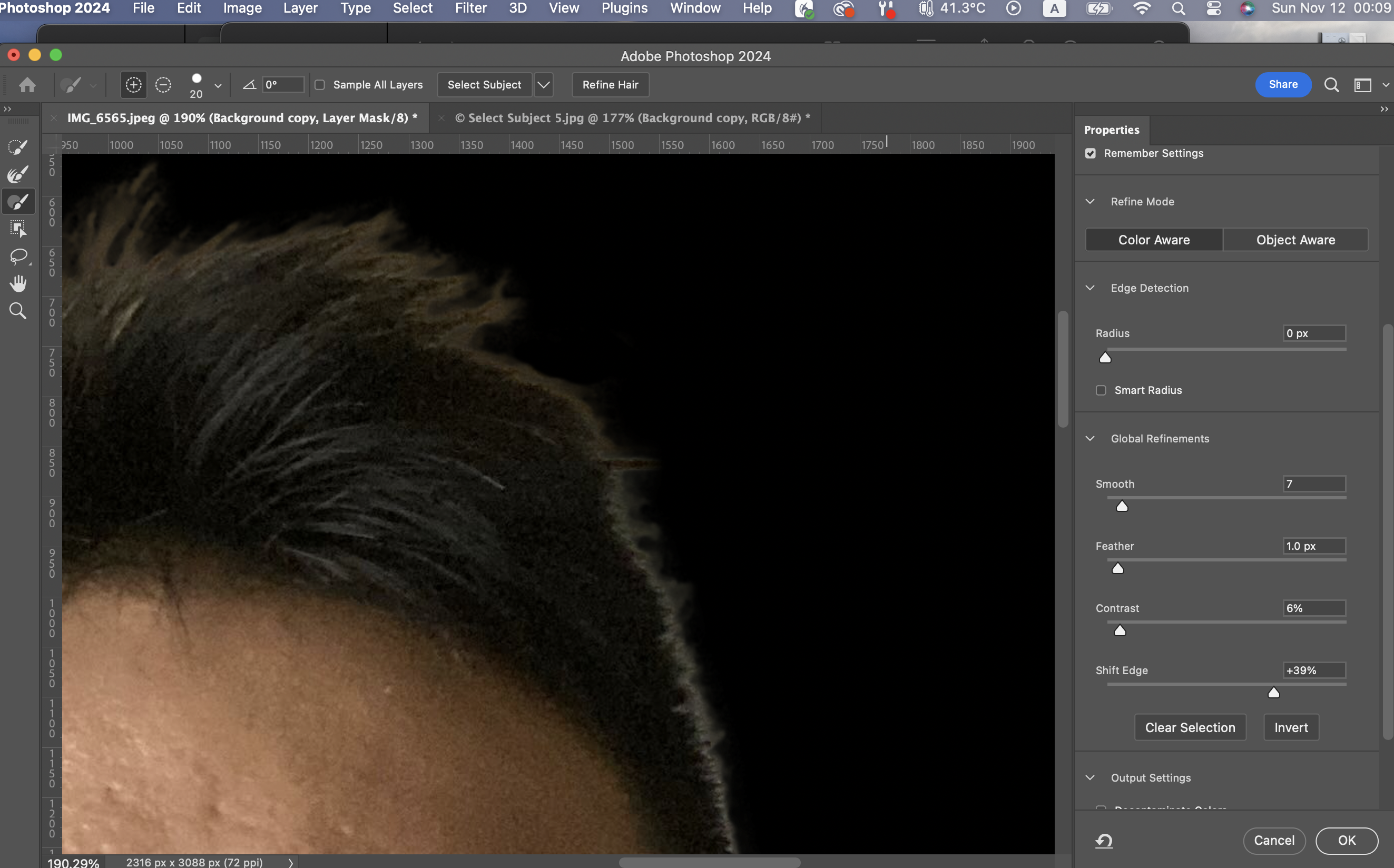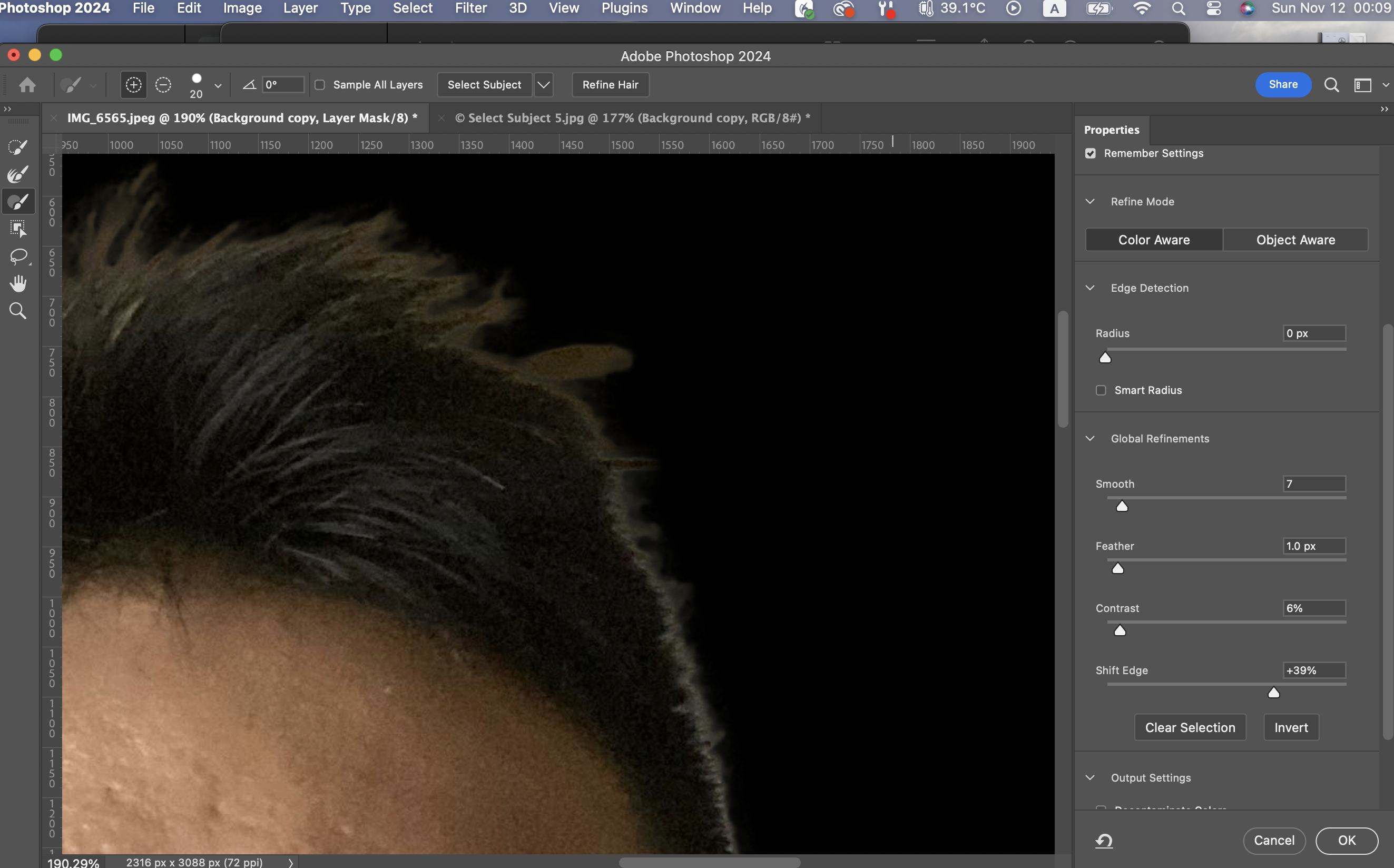 Shift Edge 값을 조정함으로써 머리카락 주위 영역을 넓히거나 줄일 수 있다.