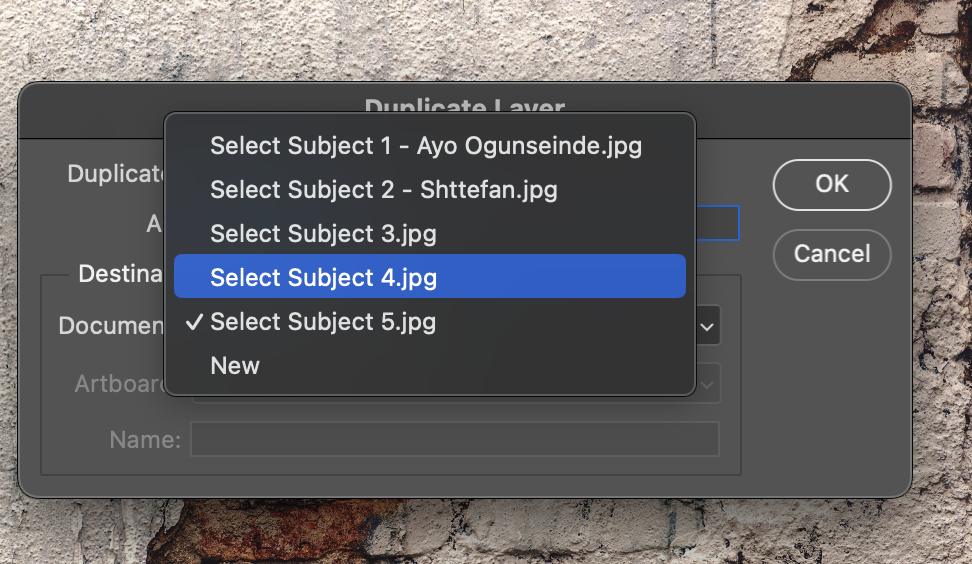 포토샵에서 열린 창들 중, 합치고자 하는 이미지가 있는 창을 선택하여 OK를 누르면