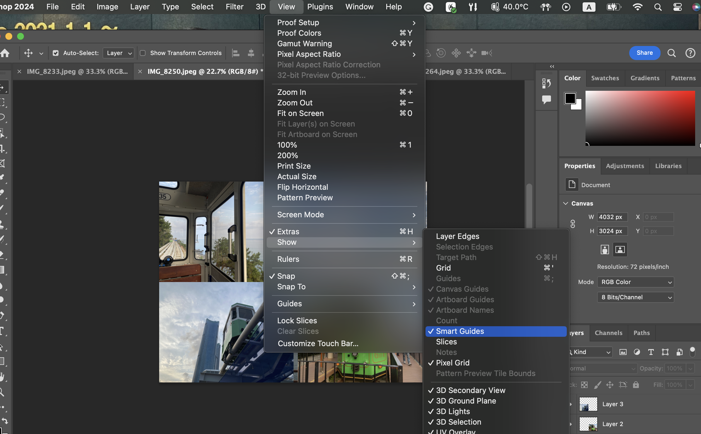 만약 스마트 가이드가 활성화 되어 있지 않다면 위 사진과 같이, View->Show->Smart Guides를 클릭함으로써 활성화할 수 있다.