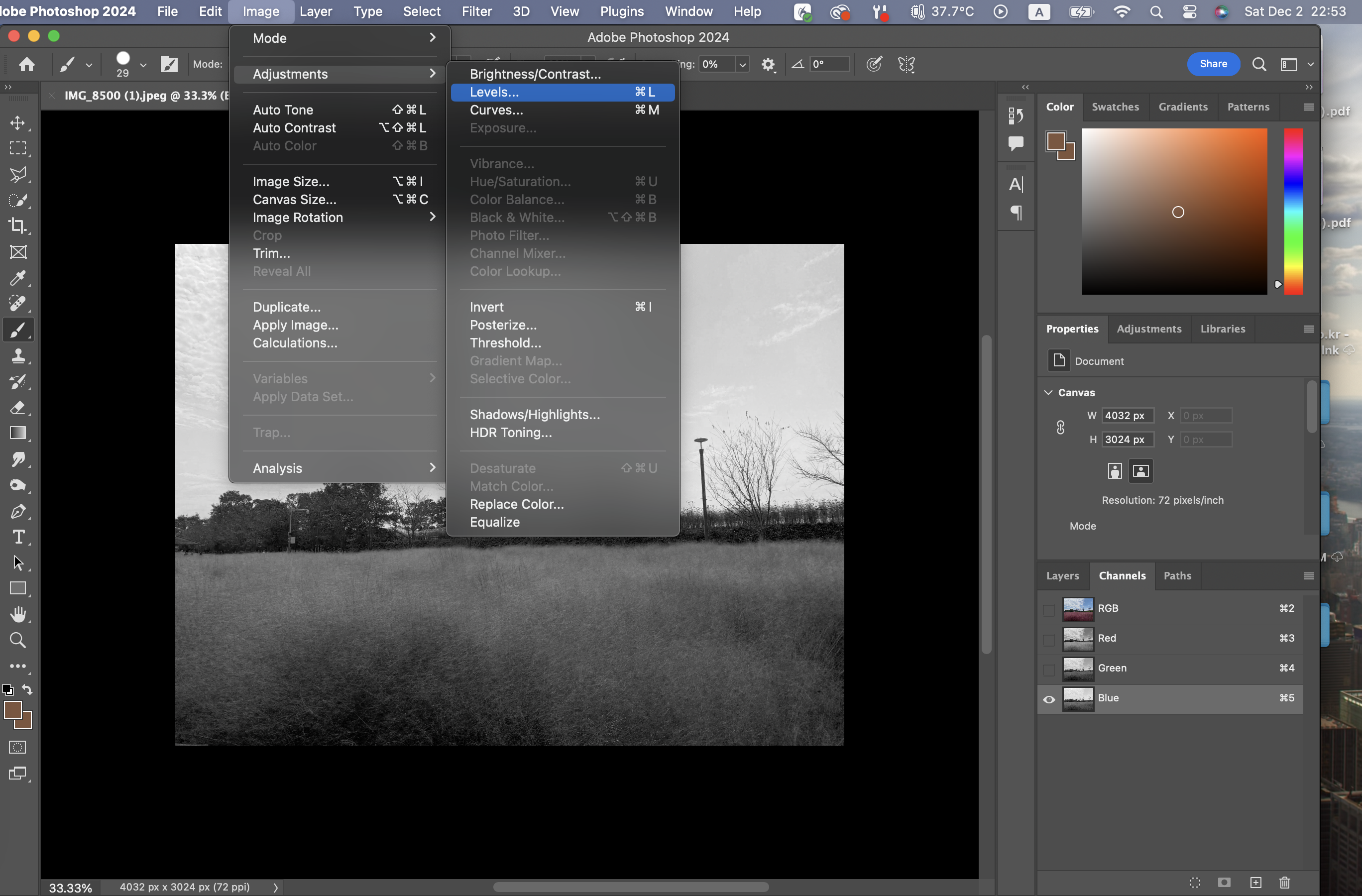 새로운 채널이 생성되었으면 Image-Adjustments-Level을 선택한다.
