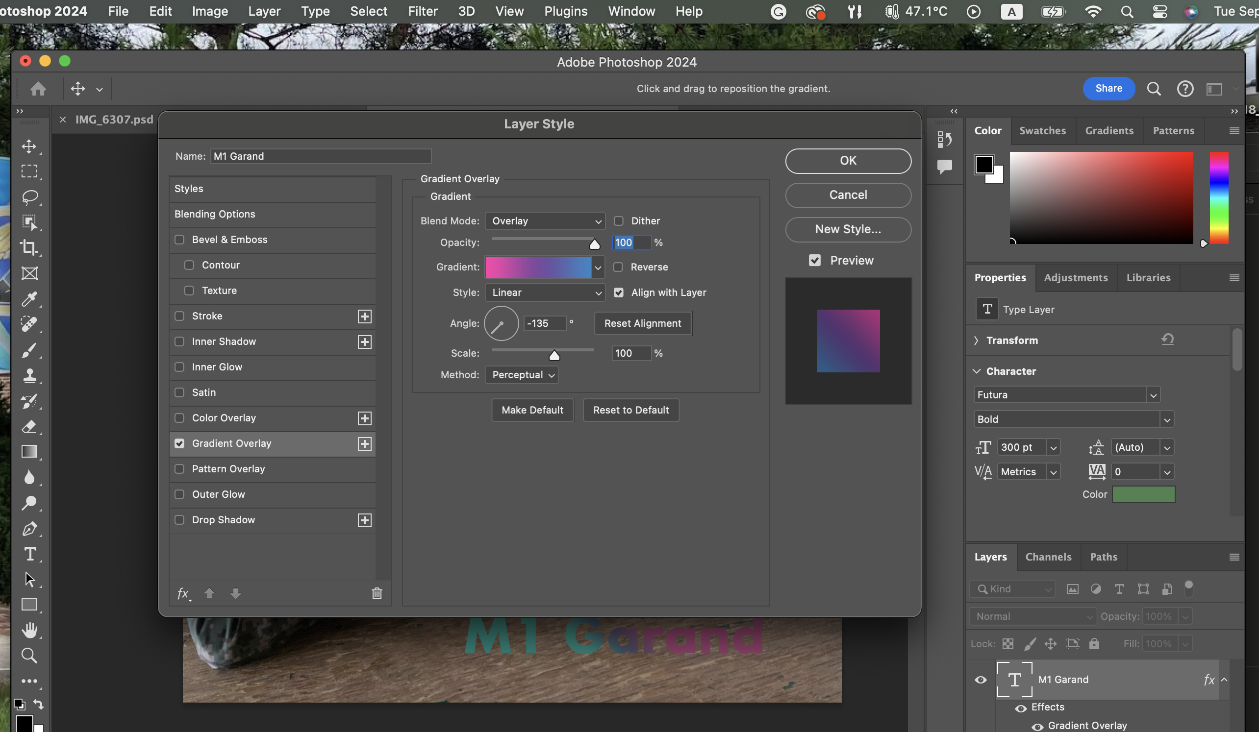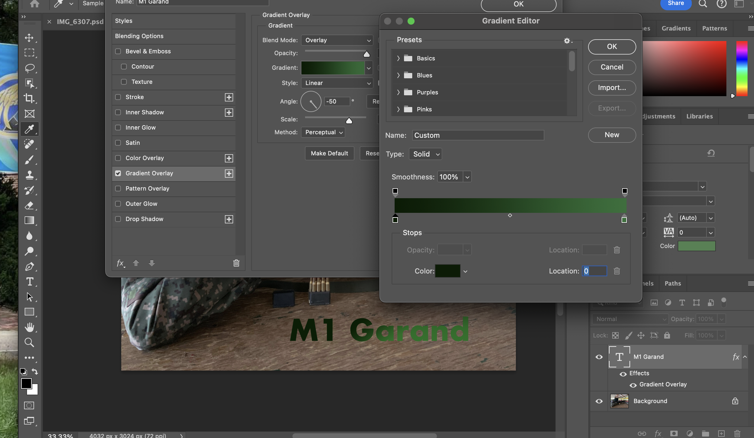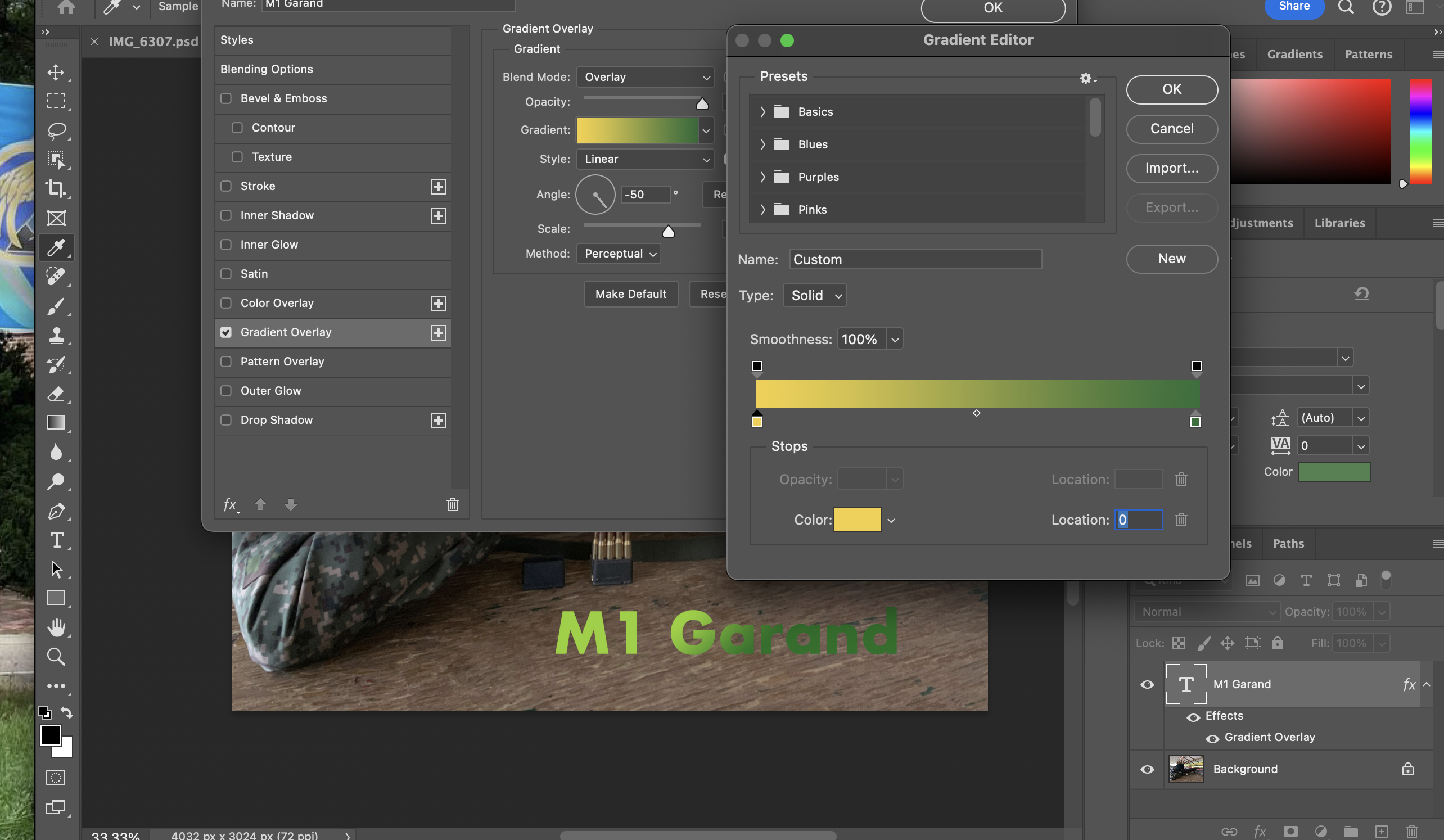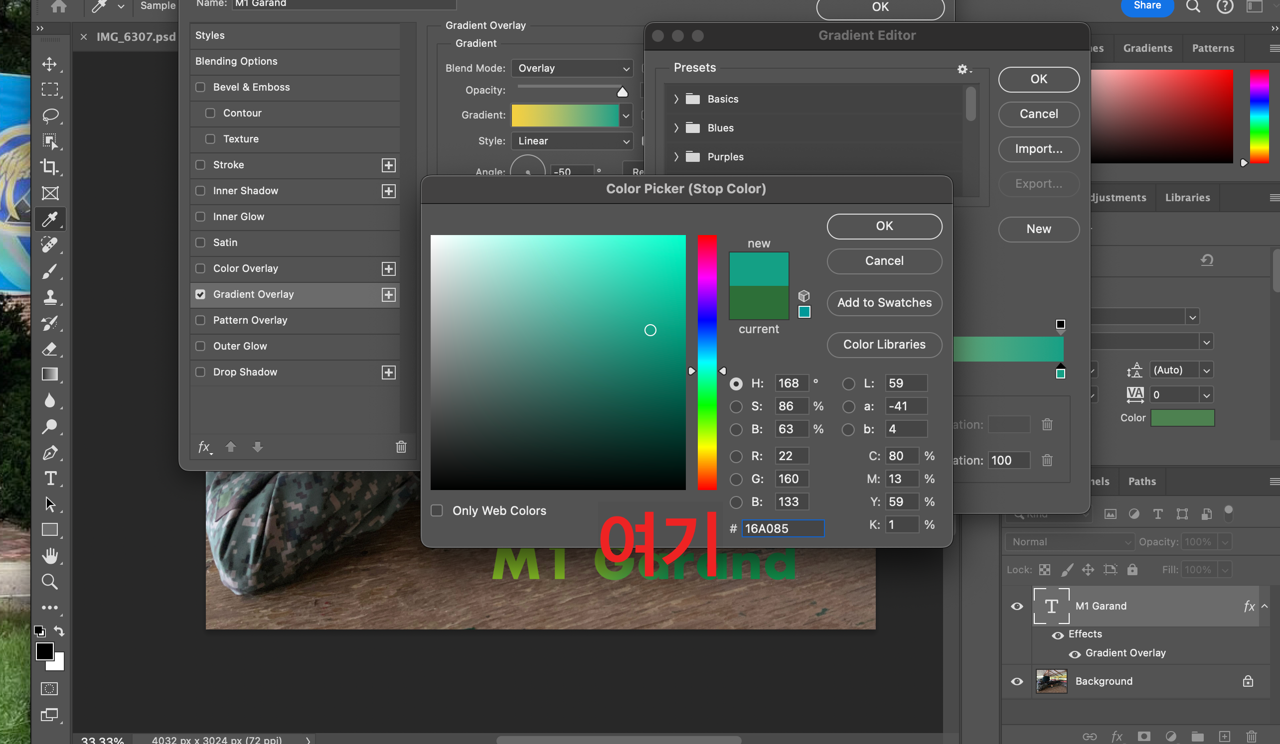 Gradient Overlay를 클릭하면서 폰트에 그래디언트가 적용된다. 하지만, 원하는 색이 아니다보니 조정을 해야 한다.