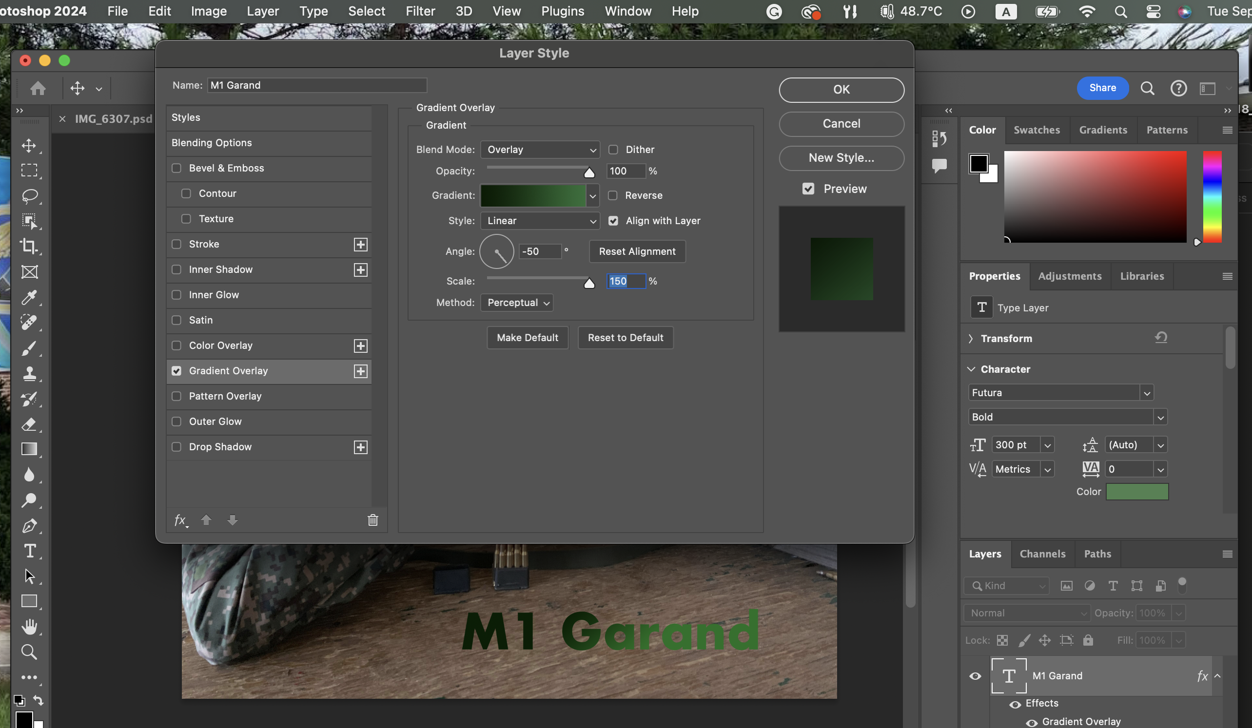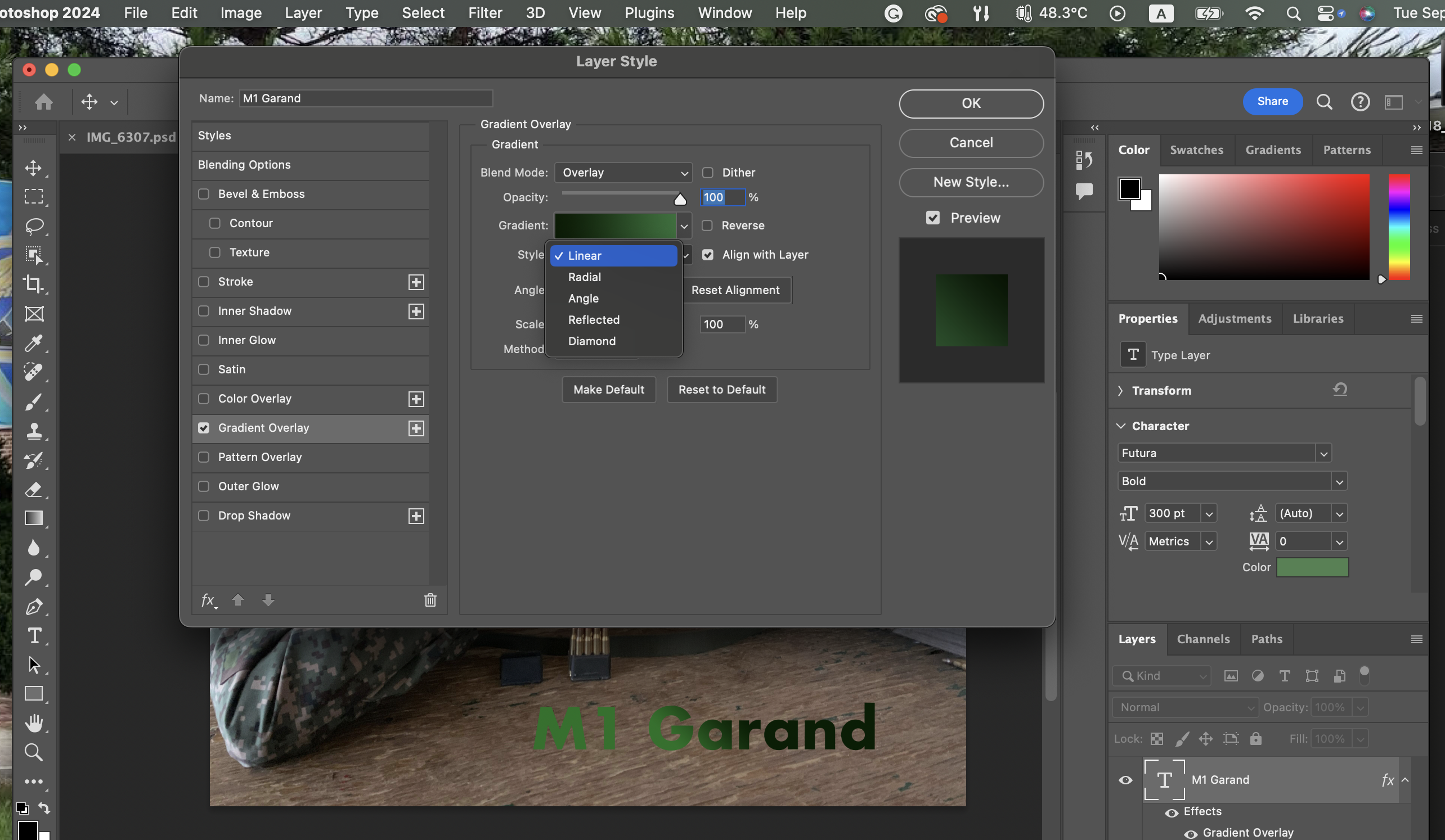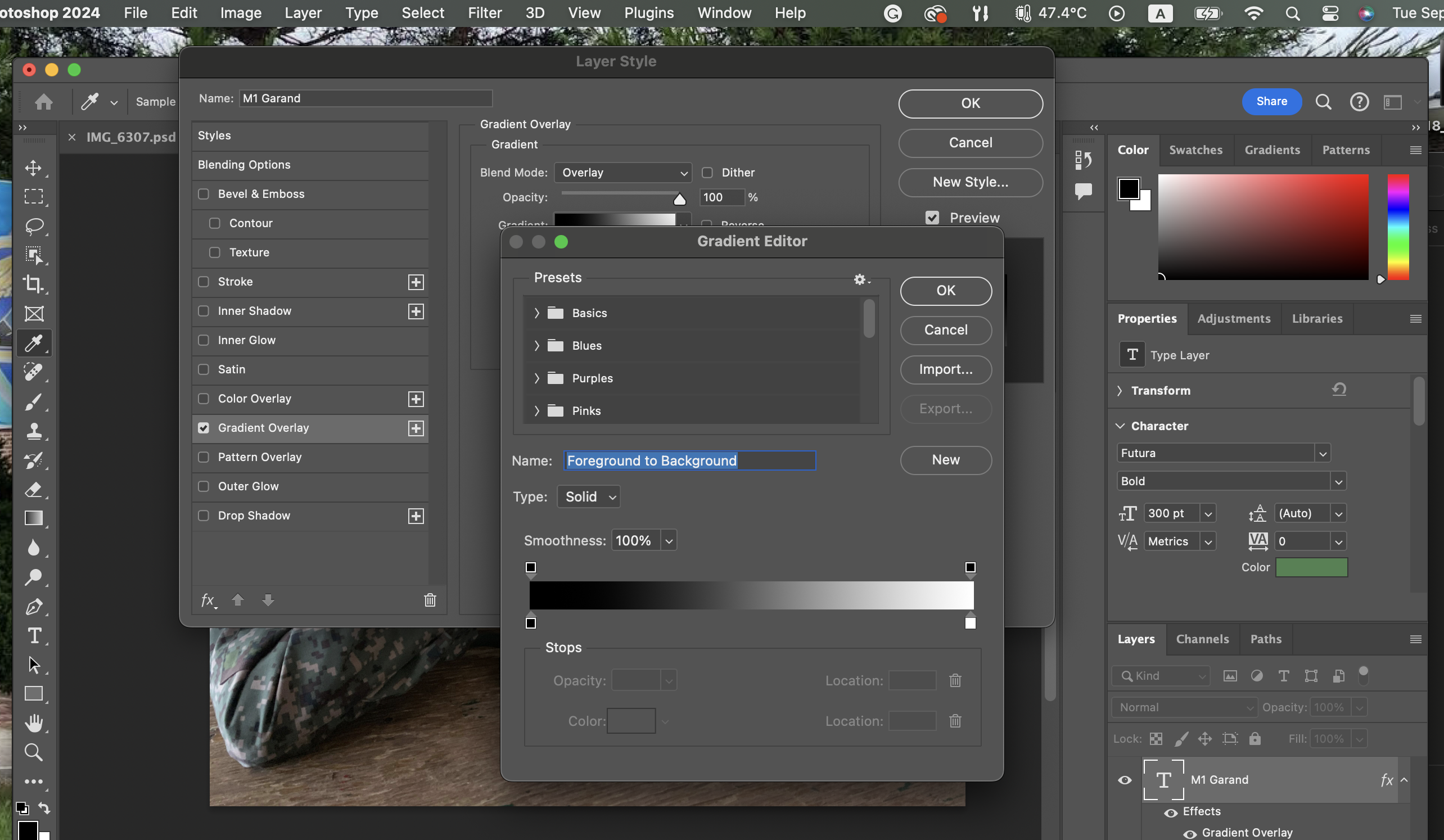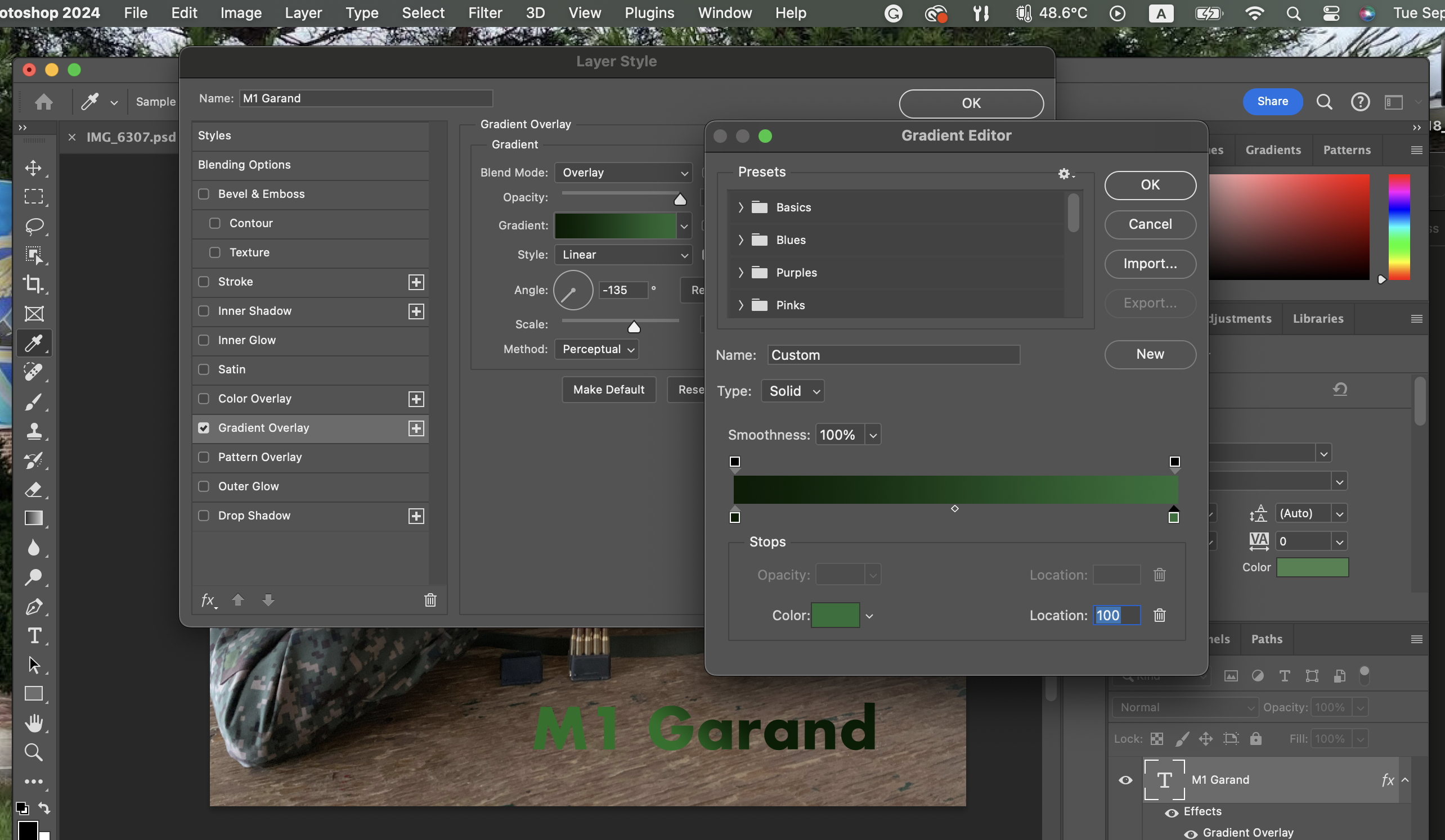 Gradient Overlay를 클릭하면서 폰트에 그래디언트가 적용된다. 하지만, 원하는 색이 아니다보니 조정을 해야 한다.