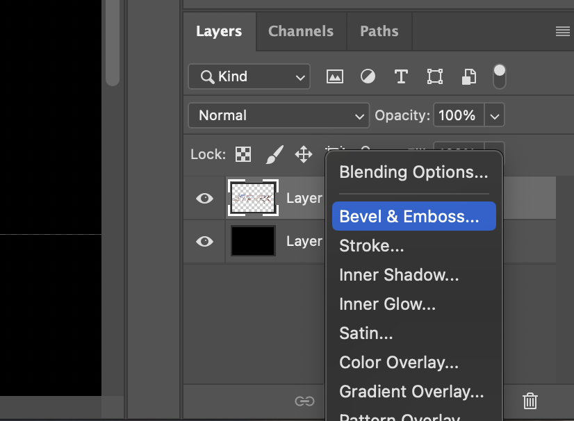 3D 효과를 내기 위해서는 앞서 합쳐진 레이어를 선택한 뒤, fx 아이콘을 눌러서 Bevel & Emboss를 클릭하면 된다.