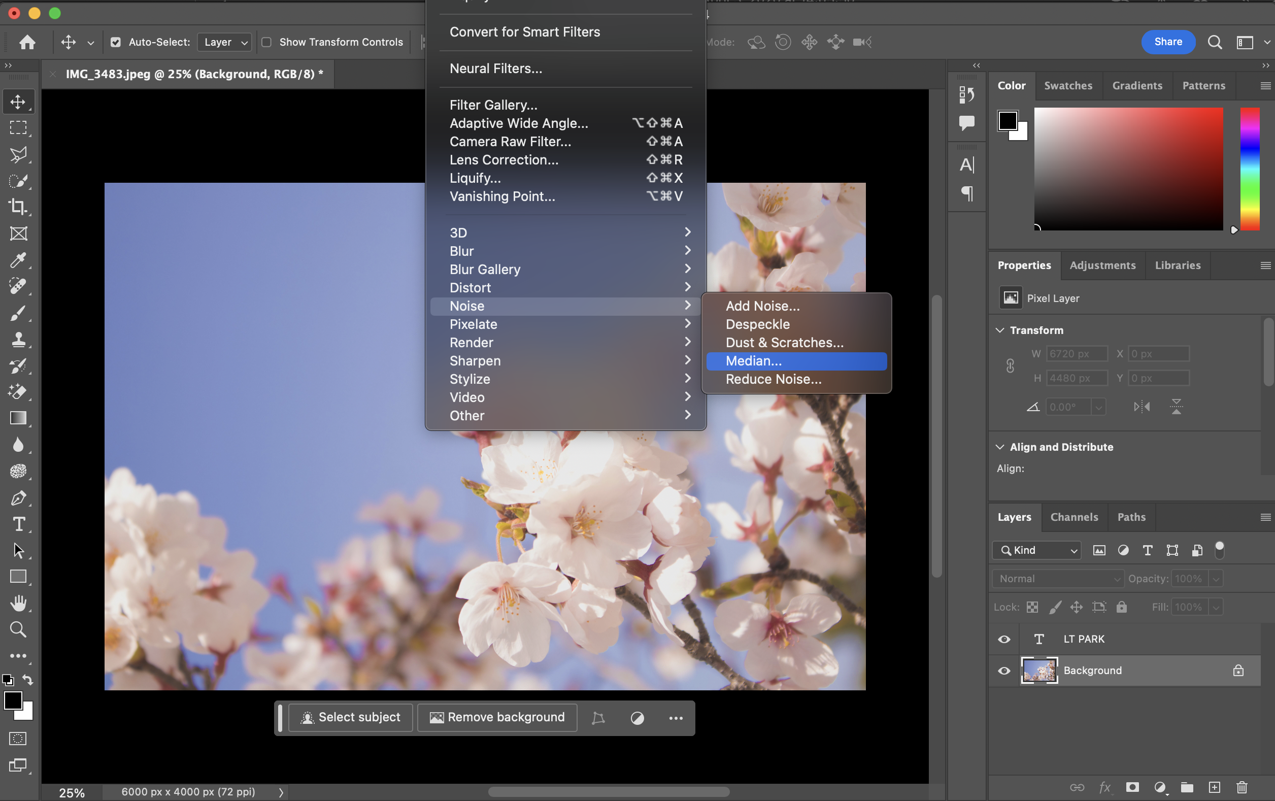 Filter-Noise-Median으로 들어가서 사진을 좀 흐릿하게 만든다.