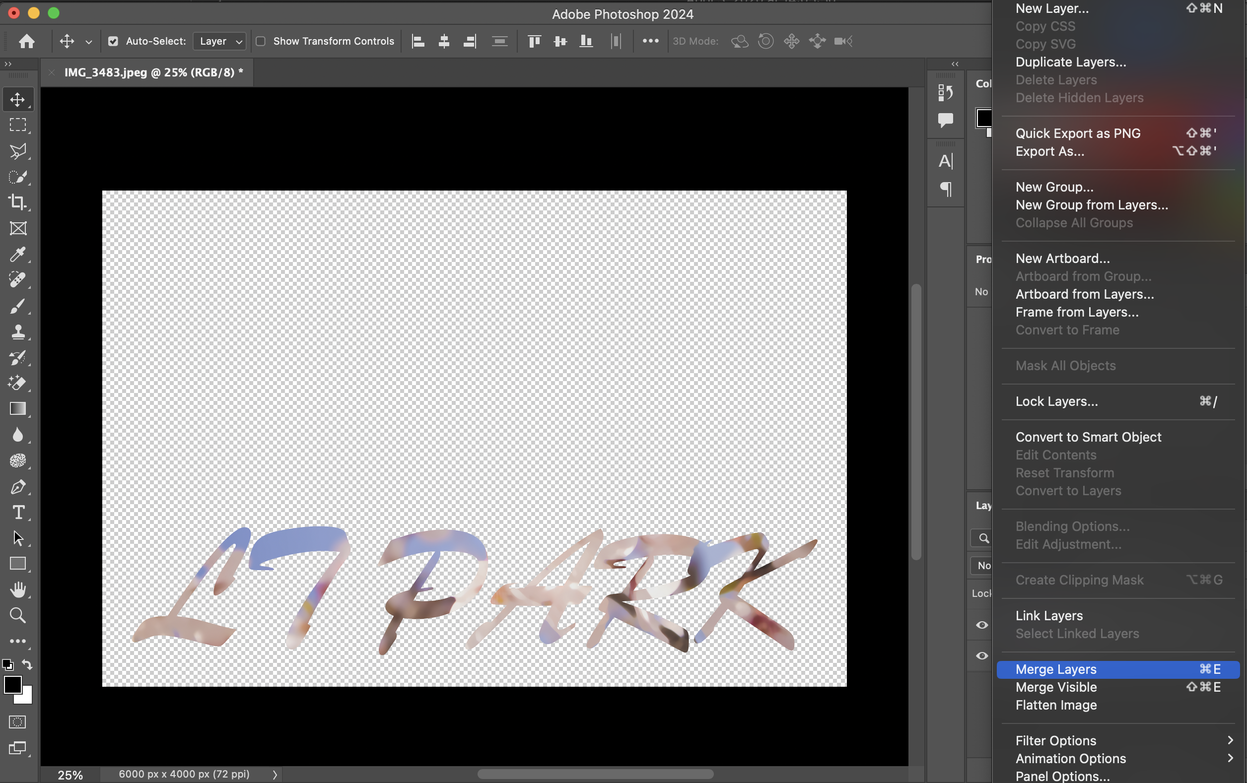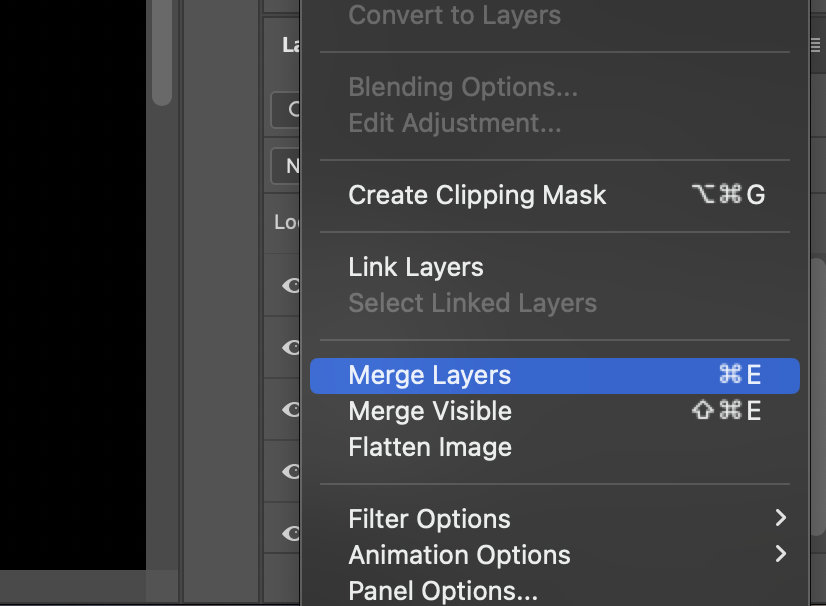 두 레이어를 선택한 뒤 레이어 창에 있는 가로 줄 4개(버거메뉴라 불림)가 있는 아이콘을 선택하여 Merge Layers가 보일 때까지