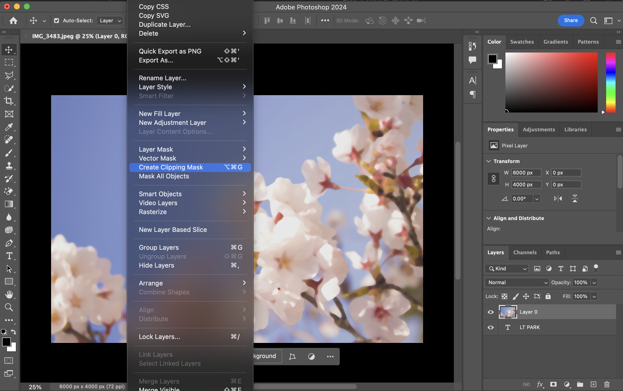 다음, 텍스트 레이어 위로 사진을 올리고 Layer-Create Clipping Mask를 클릭해준다.