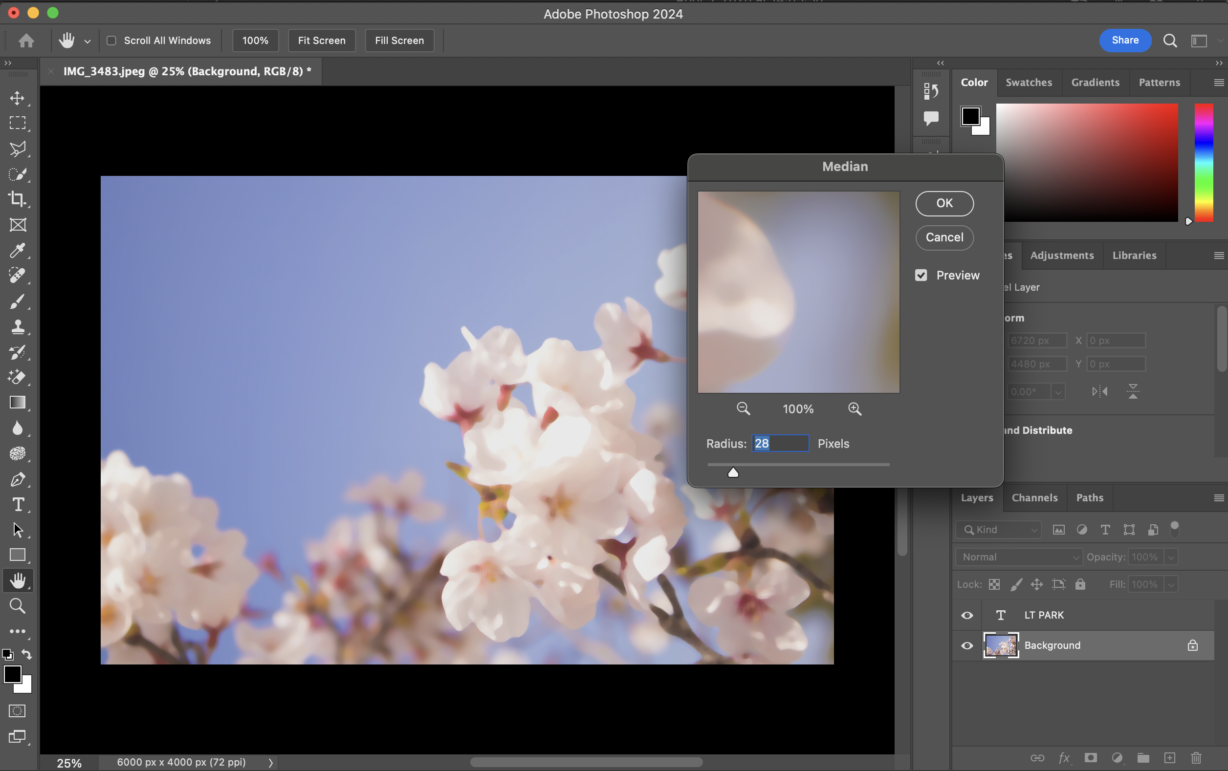 앞서 언급한 경로를 통해서 Median을 클릭하면 위와 같은 창이 뜨는데, 조정을 통해서 얼마나 더 흐릿하게 할 것인지를 정한다.