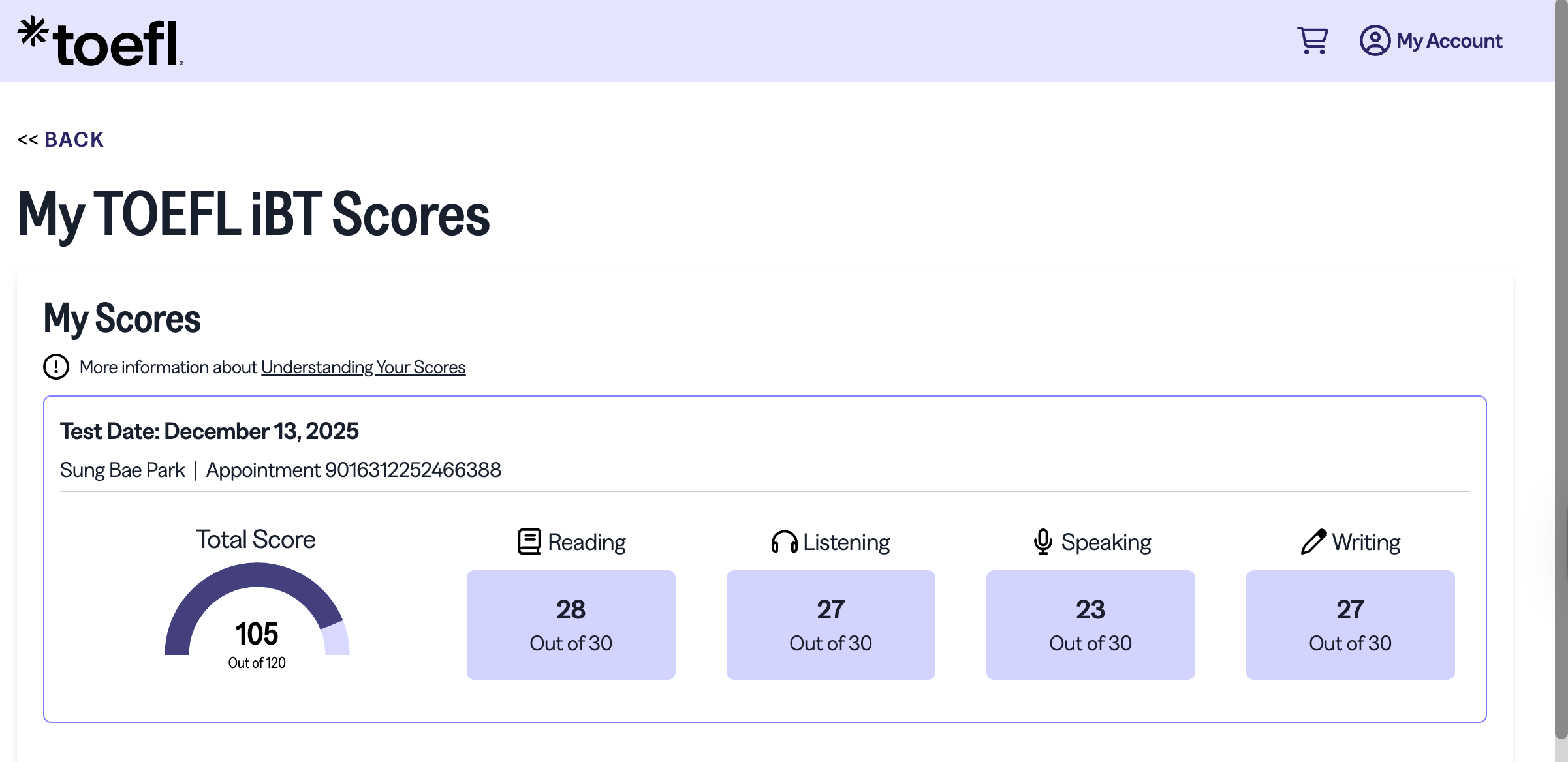 토플 성적은 105점이다.
