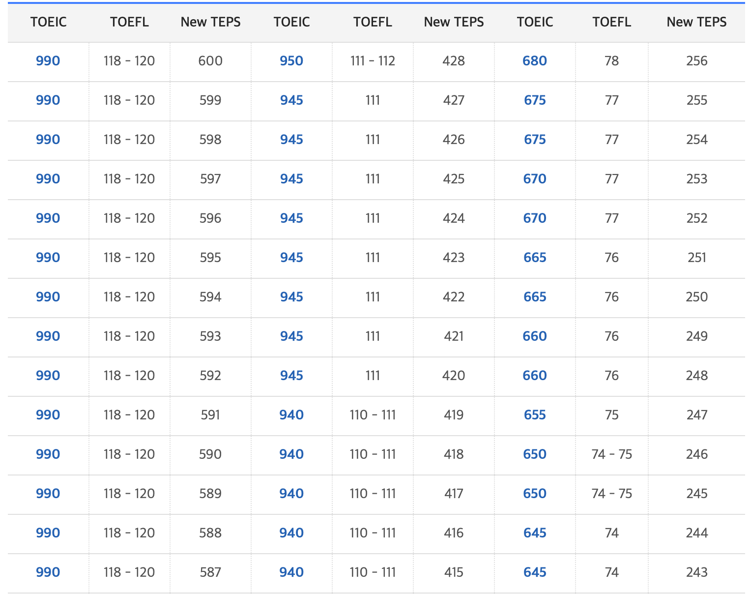 환산표를 보면 토플이 너무 저평가되었다는 생각부터 든다.
