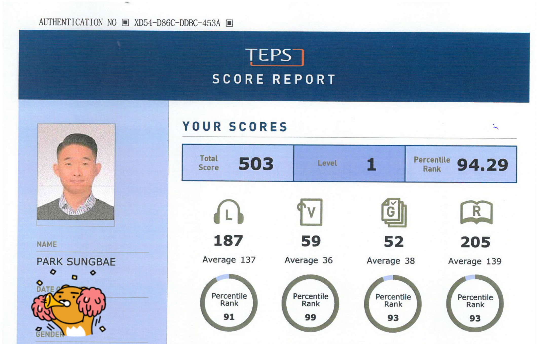 뉴텝스 503점일 때 토익 점수는 975점이니 어느정도 맞는 말인 듯하다.