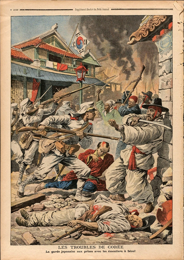 이에 반발하여 대한제국의 군대와 일본군들이 전투를 벌이고 있는 일러스트가 담긴