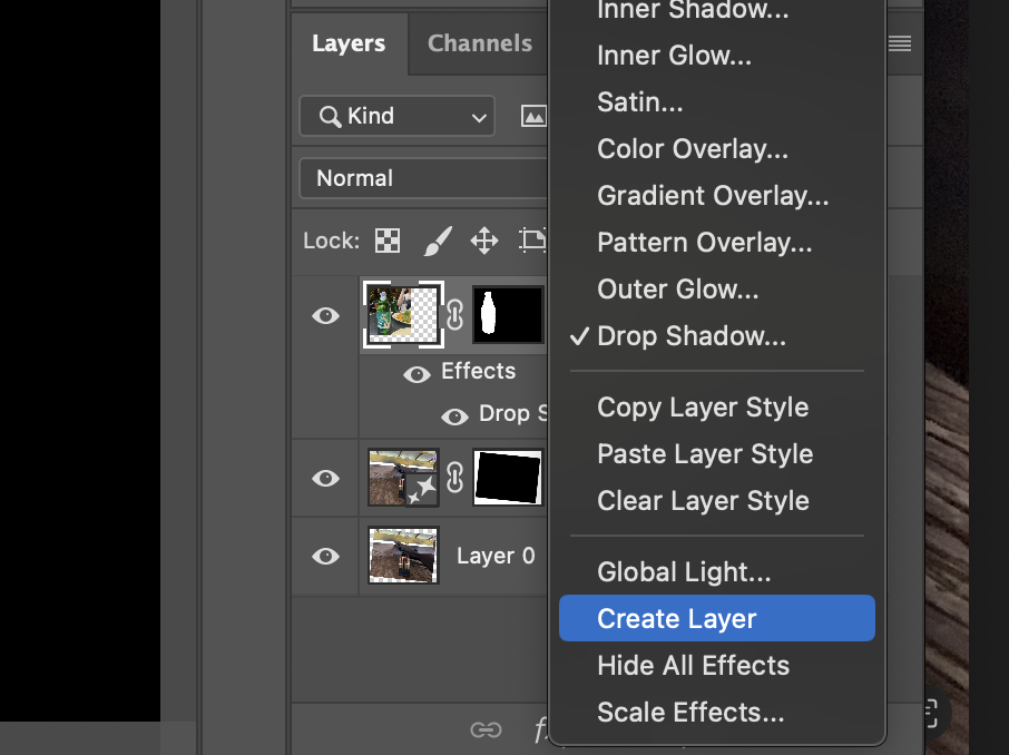 Drop shadow 효과를 우클릭하면 Create Layer 옵션을 발견할 수 있다.