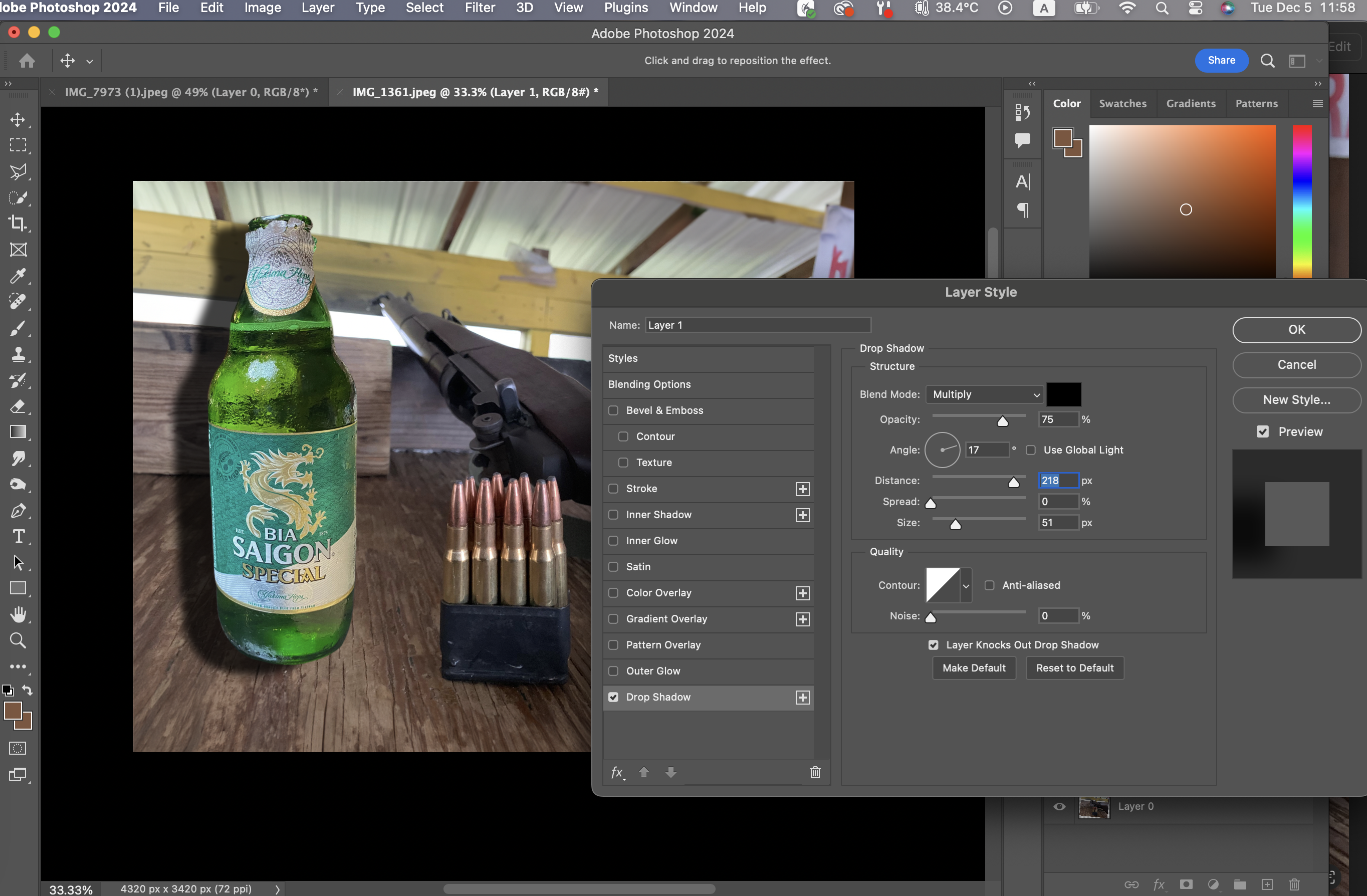 레이어 쪽에서 맥주 레이어를 선택한 상태에서 fx를 누르면 위와 같이 여러 옵션들이 나타난다.