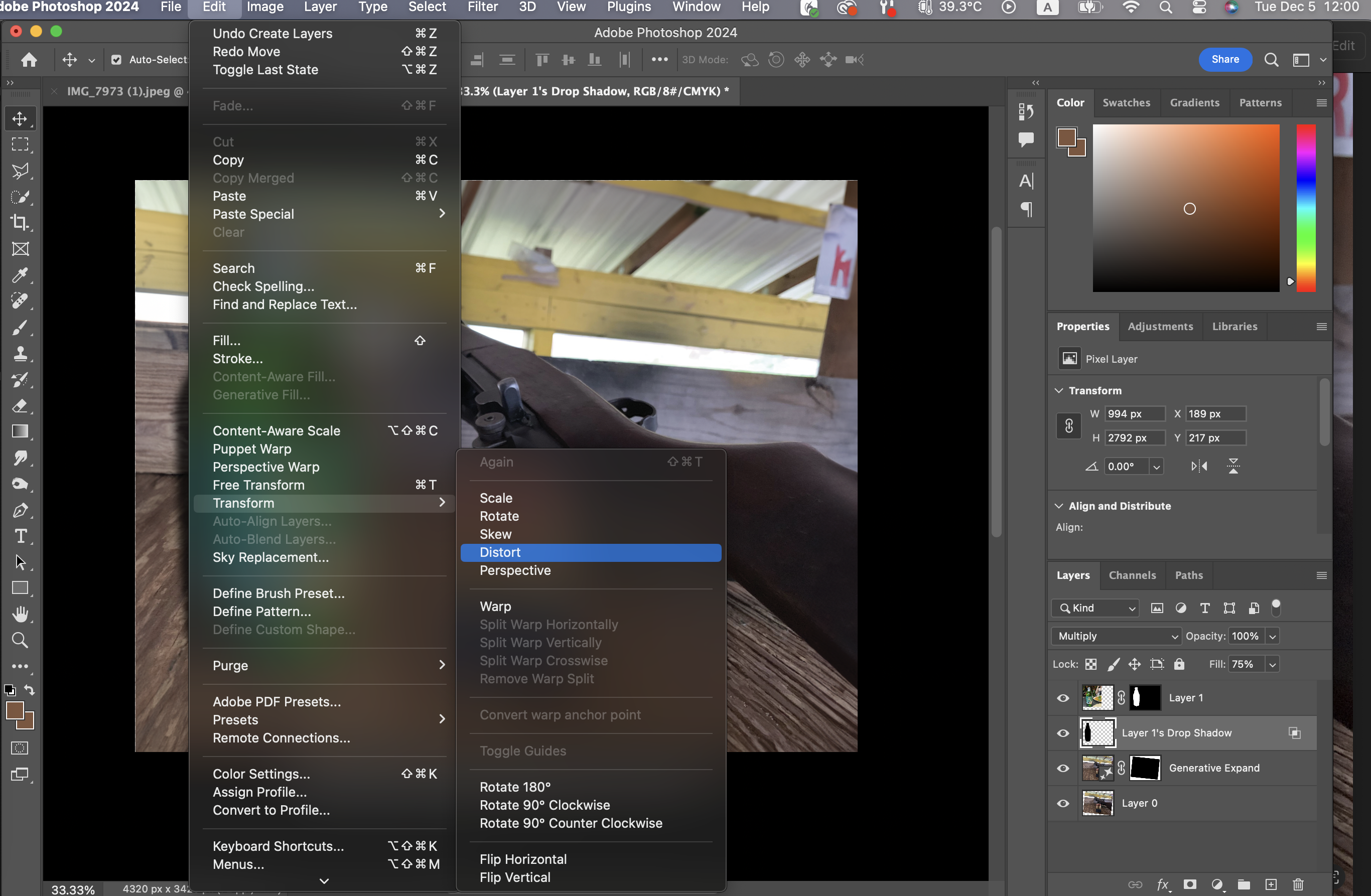 바로 Edit-Transform-Distort를 클릭해주는 것이다.