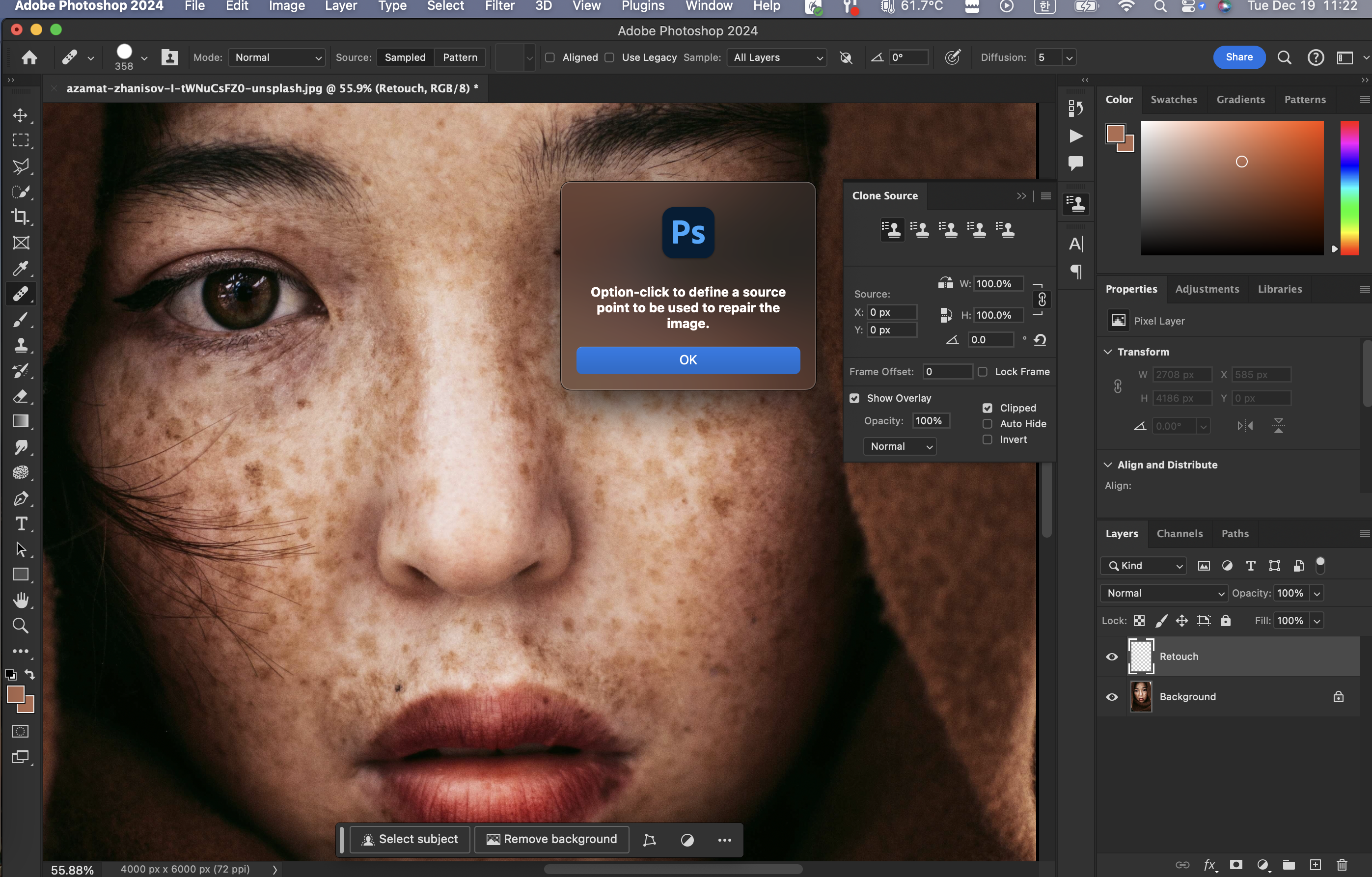 이는 옵션키(PC:알트키)를 누른 상태에서 피부가 괜찮은 곳을 선택해줌으로써 시작하면 된다.