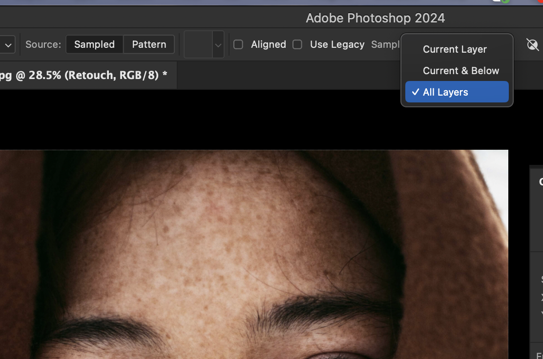 그리고 Healing Brush Tool을 선택하고 Retouch 레이어를 선택한 상태에서