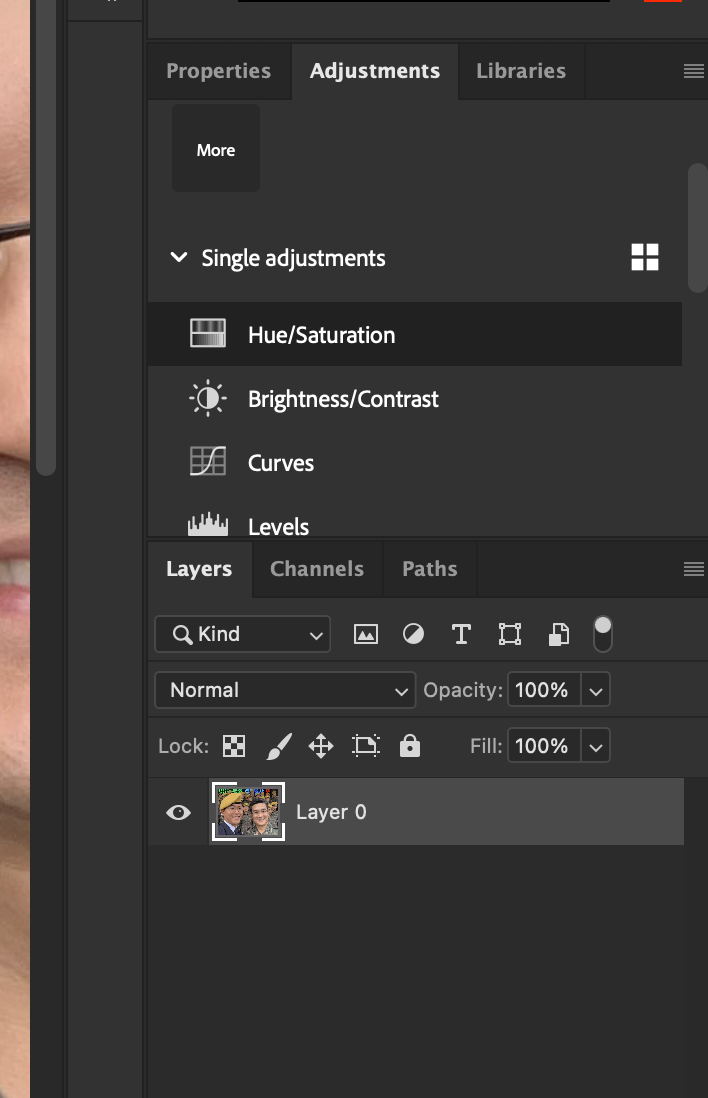 치아가 선택된 상태에서 Adjustment 패널로 가서 Hue/Saturation을 클릭해준다.