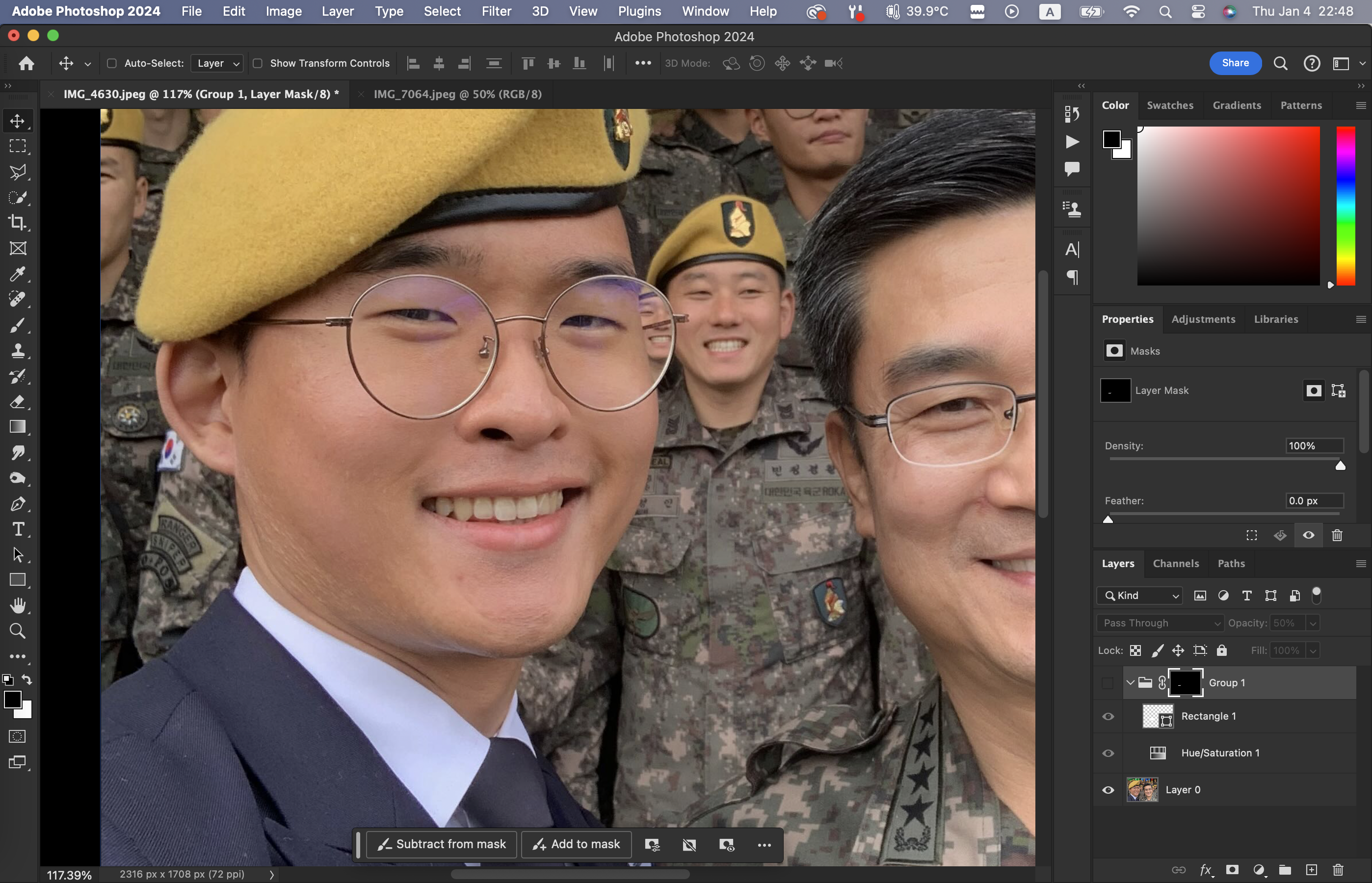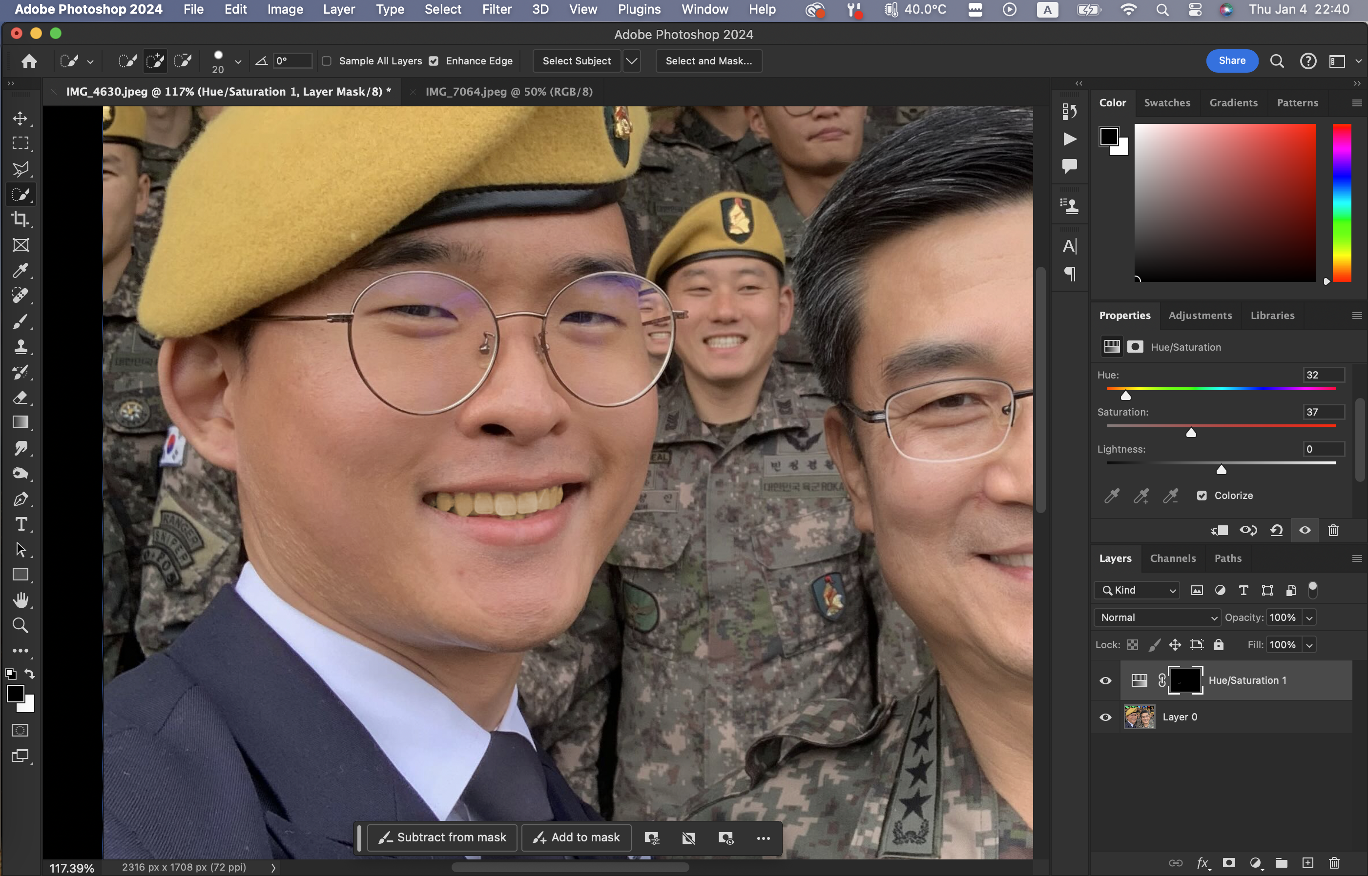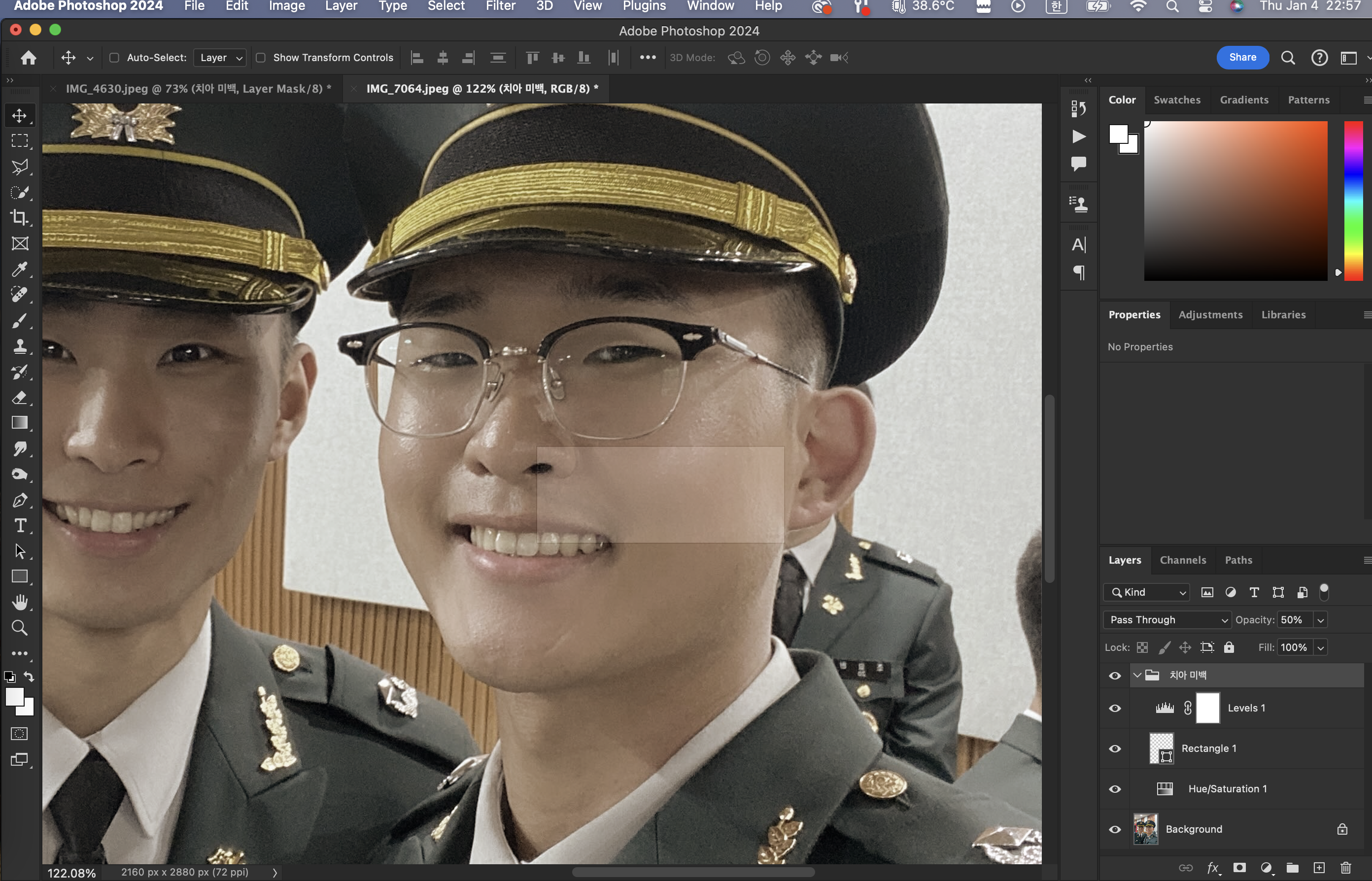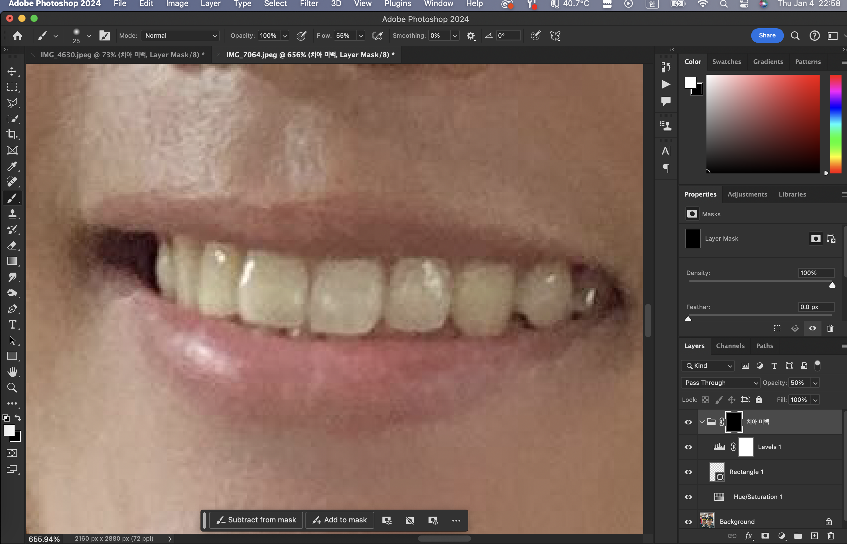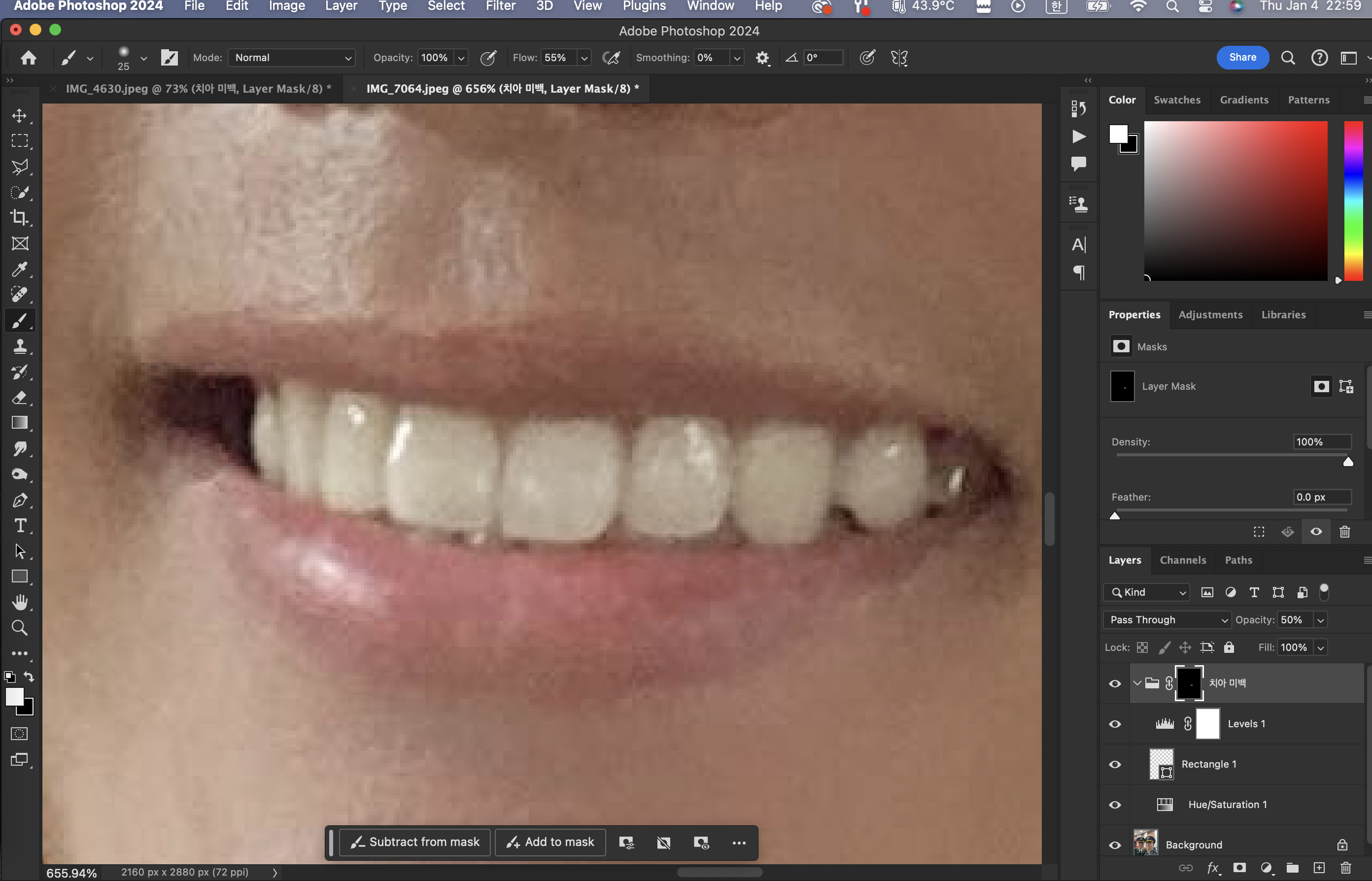이렇게 하면 치아에 레이어 마스크가 적용 되면서 Hue/Saturation이 치아에만 적용된다.
