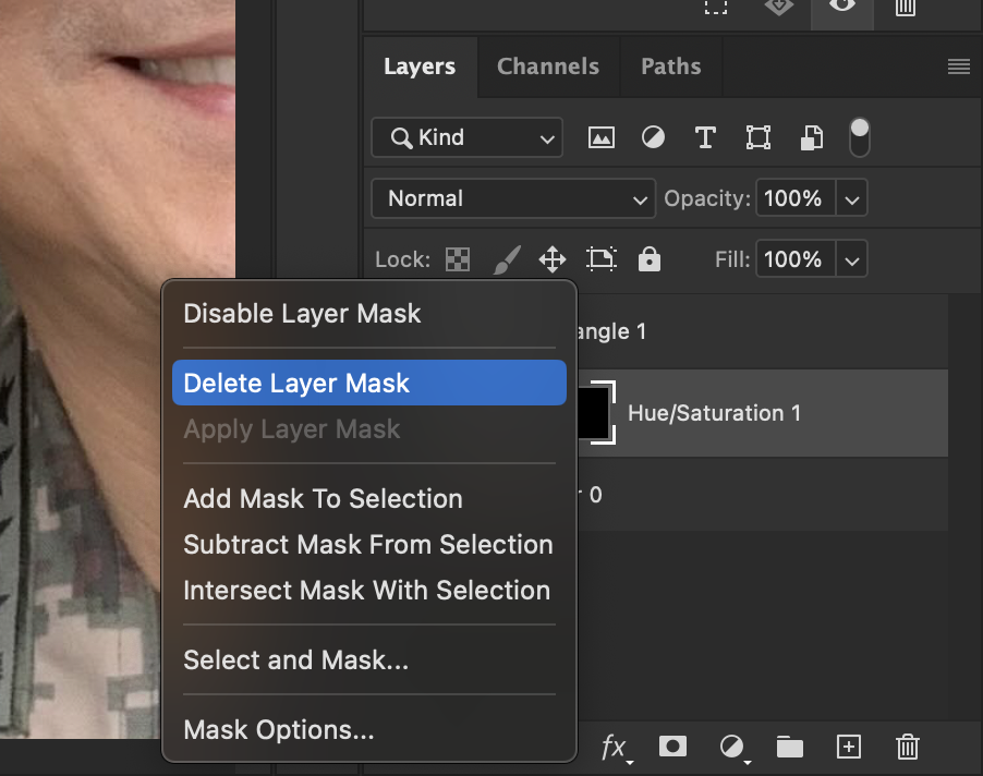 이는 레이어 마스크를 우클릭하고 Delete Layer Mask를 클릭함으로써 진행할 수 있다.