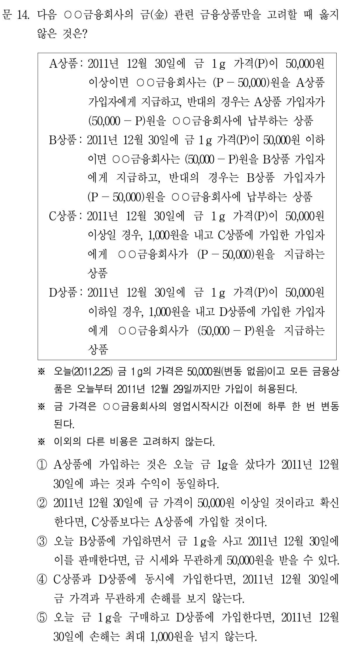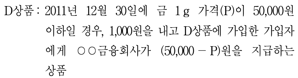 5번. 오늘 금 1g을 구매하고 D상품에 가입한다면, 2011년 12월 30일에 손해는 최대 1,000원을 넘지 않는다.