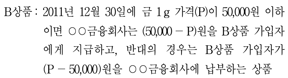 3번. 오늘 B상품에 가입하면서 금 1g을 사고 2011년 12월 30일에 이를 판매한다면, 금 시세와 무관하게 50,000원을 받을 수 있다.