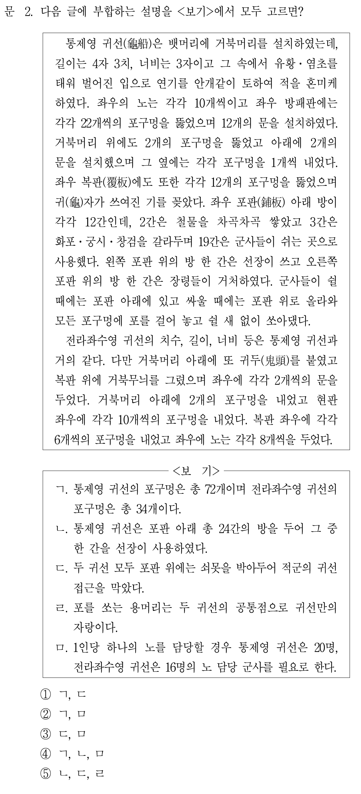 ㄷ. 두 귀선 모두 포판 위에는 쇠못을 박아두어 적군의 귀선 접근을 막았다.