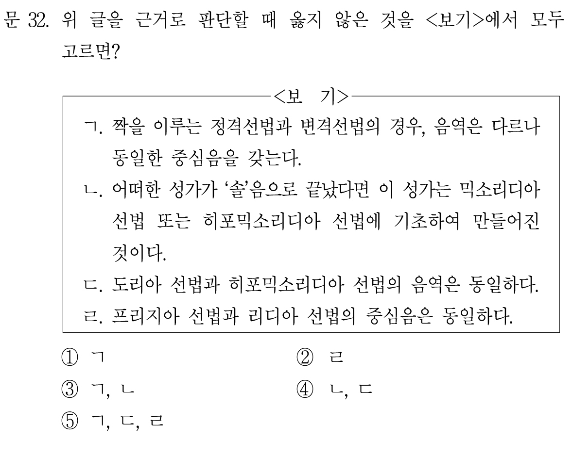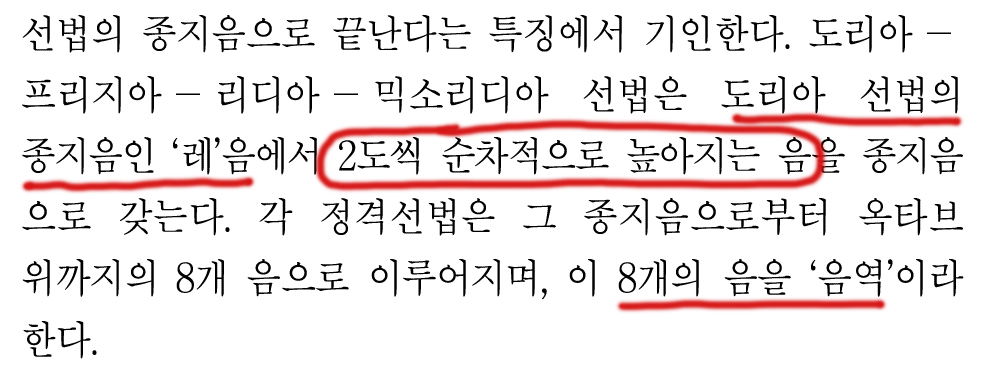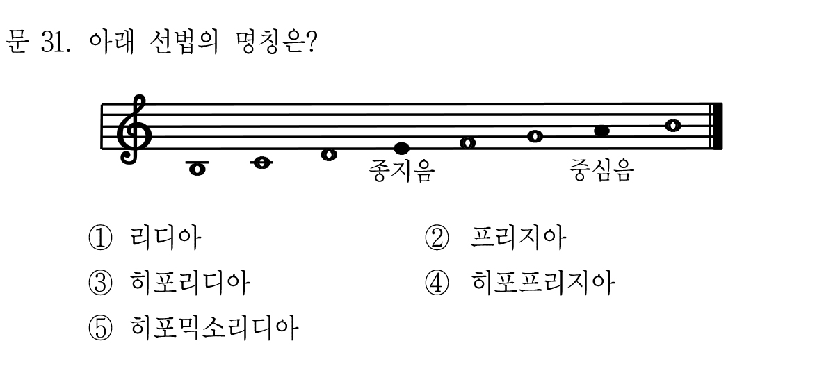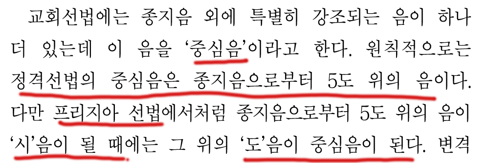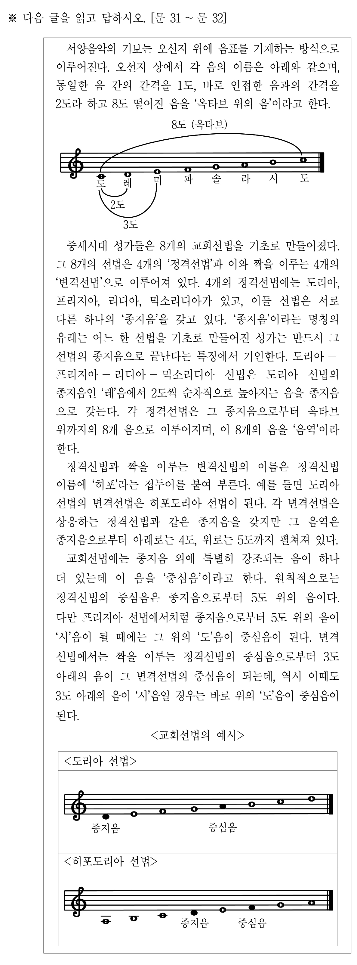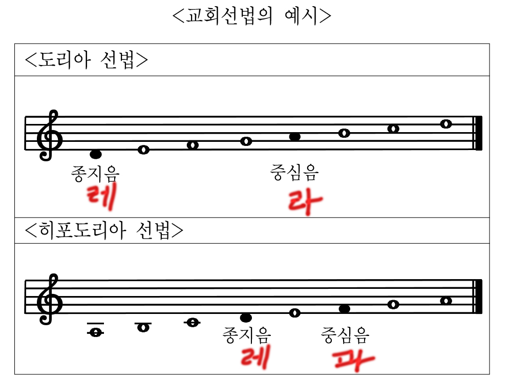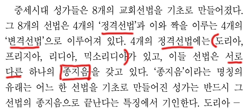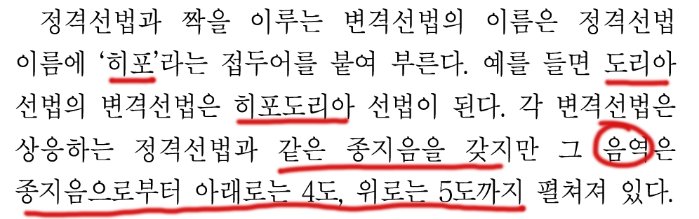 그리고 도리아와 히포도리아의 종지음과 중심음을 보여주면서 지문이 끝난다.