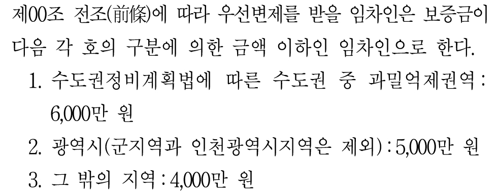 이걸 보면 갑, 을, 병이 우선적으로 받을 수 있는 '보증금 중 일정액'은 2,000만원을 초과할 수 없다.