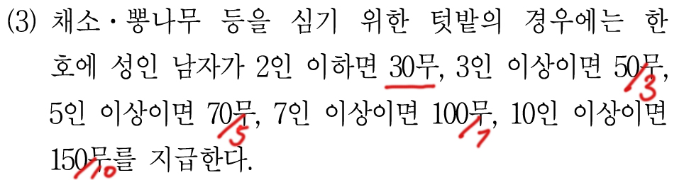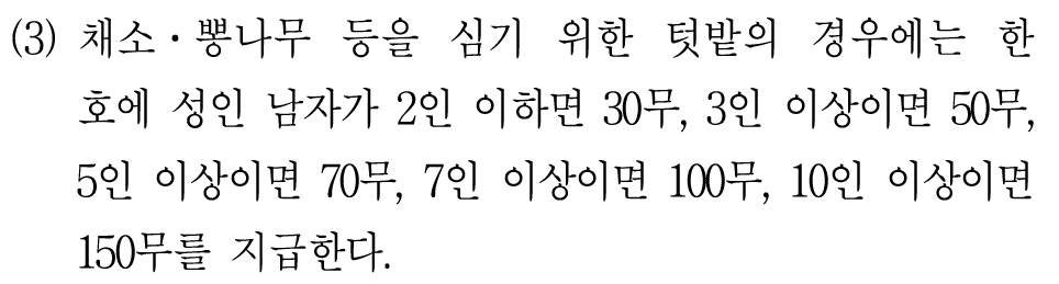 텃밭으로 100무를 받았다는 것은 한 호에 성인 남자가 7인 이상 10인 미만이라는 말이다.