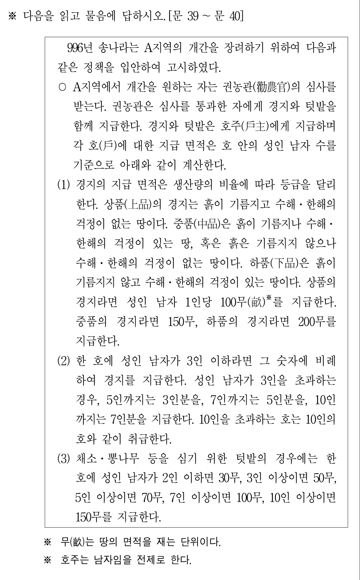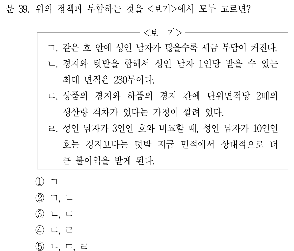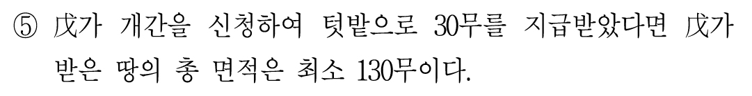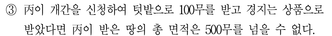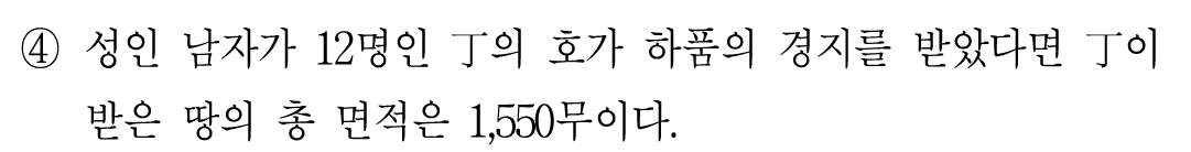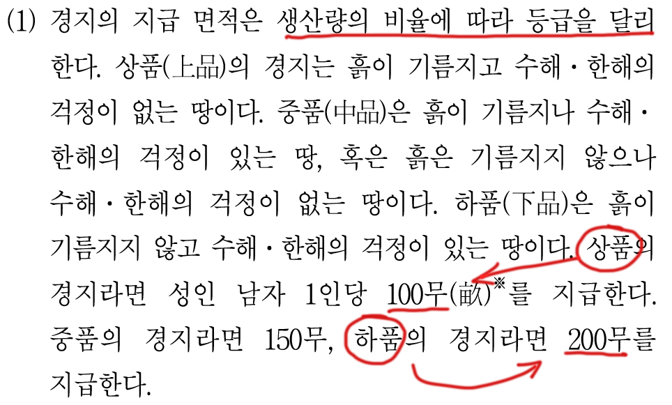 ㄷ. 상품의 경지와 하품의 경지 간에 단위면적당 2배의 생산량 격차가 있다는 가정이 깔려 있다.