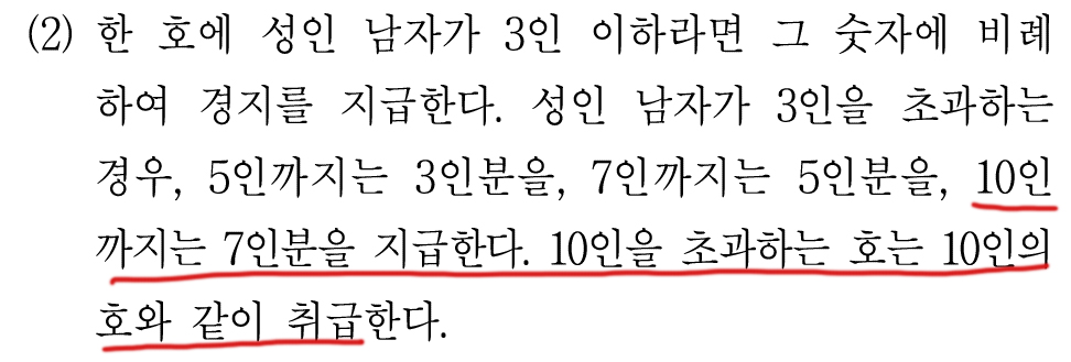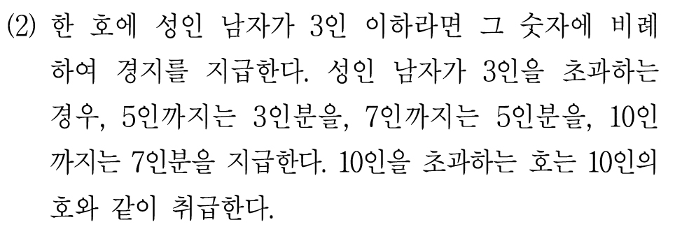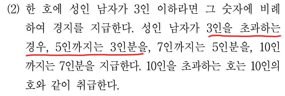 성인 남자가 3인을 초과하는 경우, 5인까지는 3인분을, 7인까지는 5인분을, 10인까지는 7인분을 지급한다. 10인을 초과하는 호는 10인의 호와 같이 취급한다.