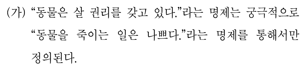 "동물은 살 권리를 갖고 있다."라는 권리용어가 포함된 명제를 정의할 때 (가)와 (나)의 정의는 양립할 수 없는 것이다.