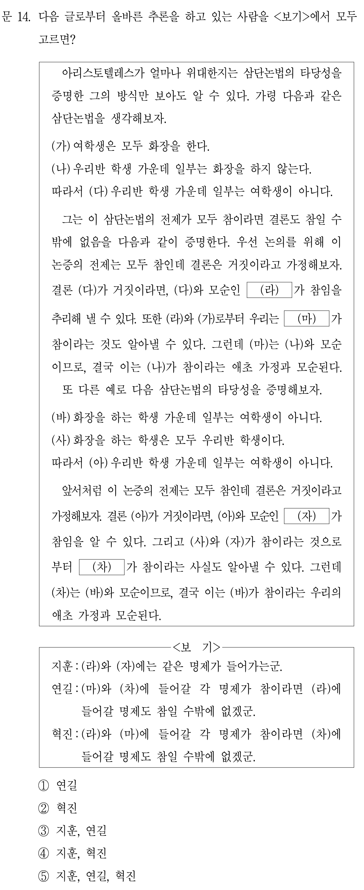 혁진: (라)와 (마)에 들어갈 각 명제가 참이라면 (차)에 들어갈 명제도 참일 수밖에 없겠군.