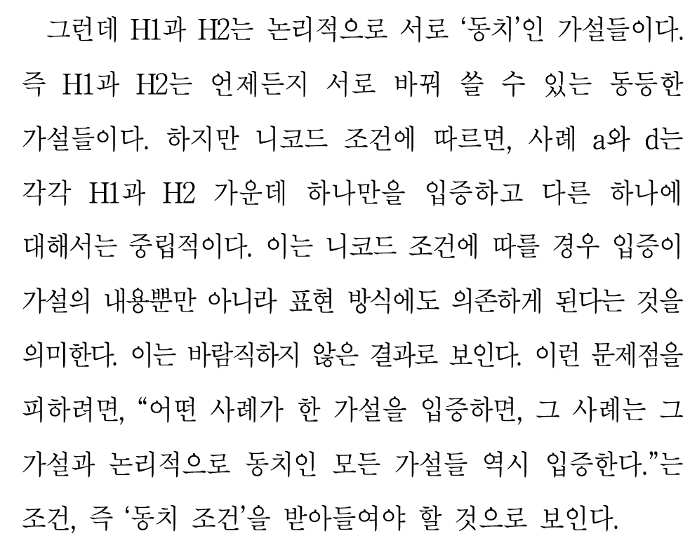 사례 d가 H2를 입증하니까 사례 d는 H1도 입증한다는 '동치 조건'을 받아들이는 것이다.