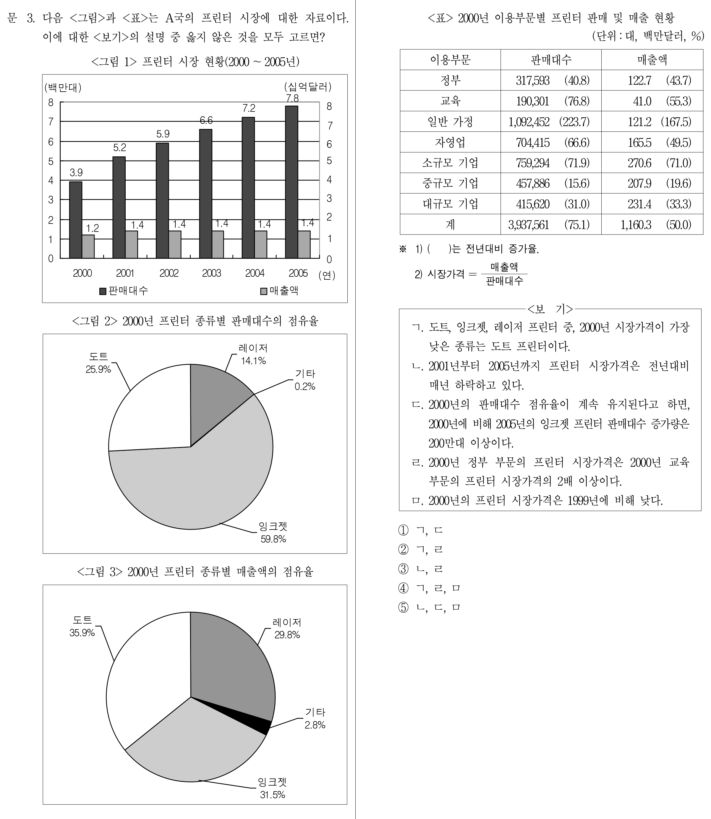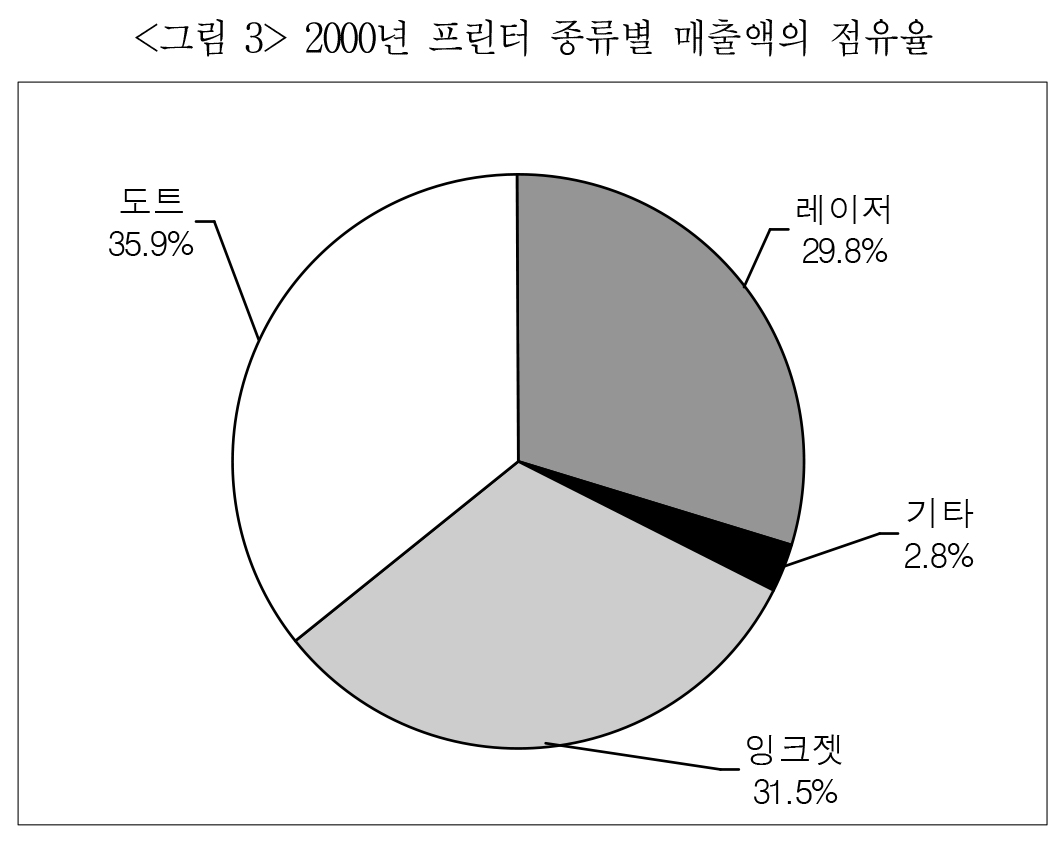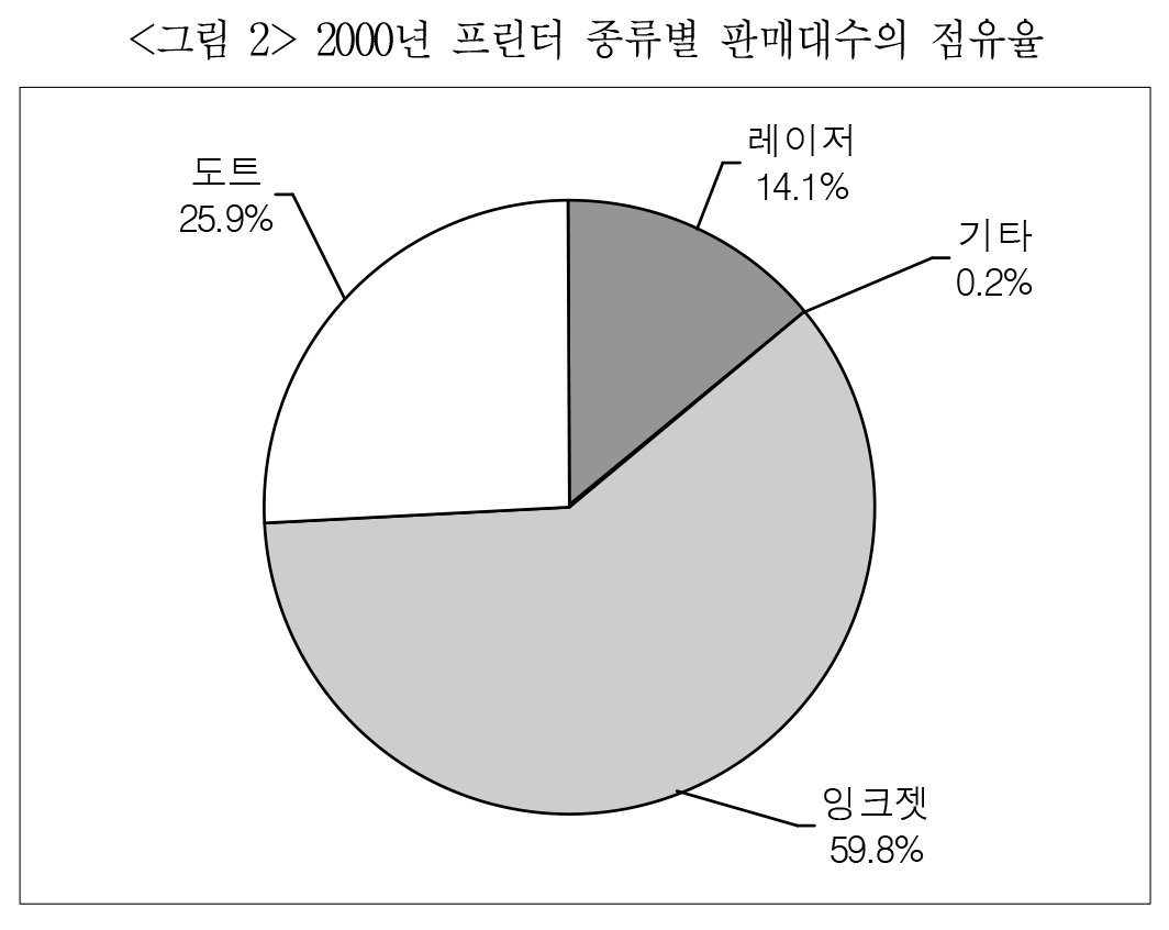 ㄷ. 2000년의 판매대수 점유율이 계속 유지된다고 하면, 2000년에 비해 2005년의 잉크젯 프린터 판매대수 증가량은 200만대 이상이다.
