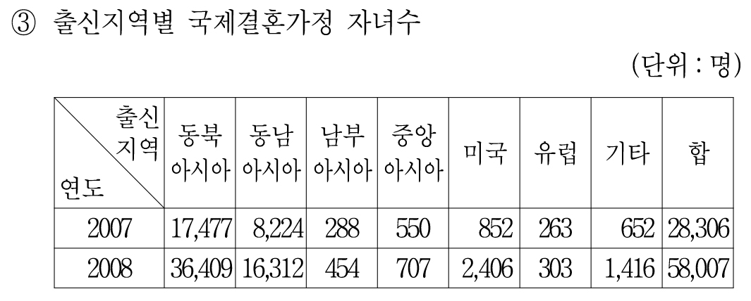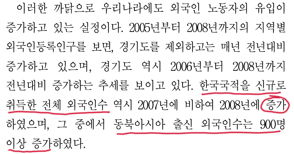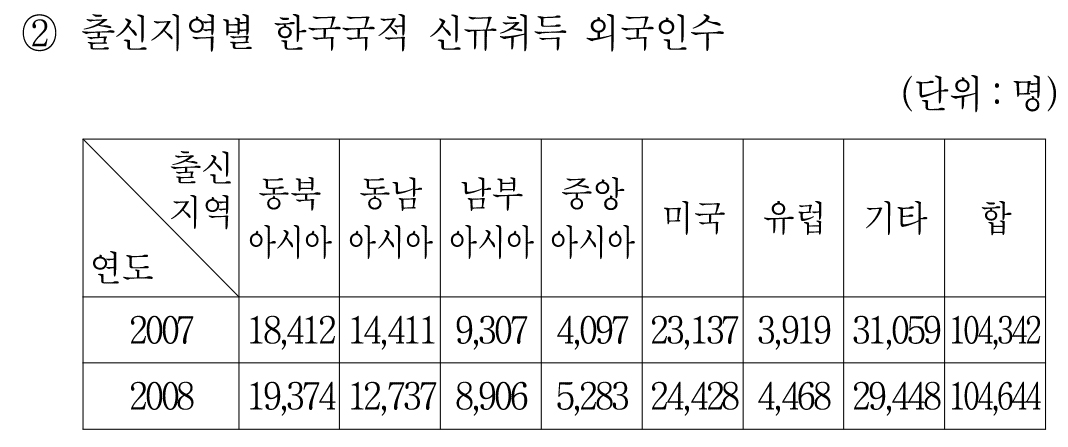 한국 국적을 신규로 취득한 외국인 중 동북아시아 출신은 2007년에 비해 900명 증가했다.