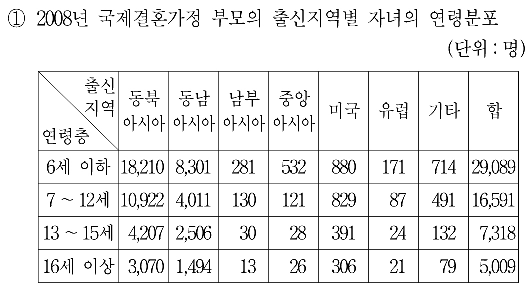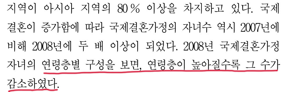 연령층이 높아질수록 국제결혼가정 자녀의 수가 감소한다.
