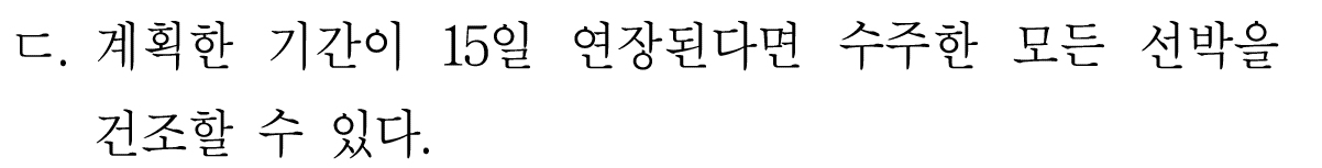 ㄱ.에서 봤듯이, 25일 안에 F를 제외한 모든 선박을 만들 수 있었다.