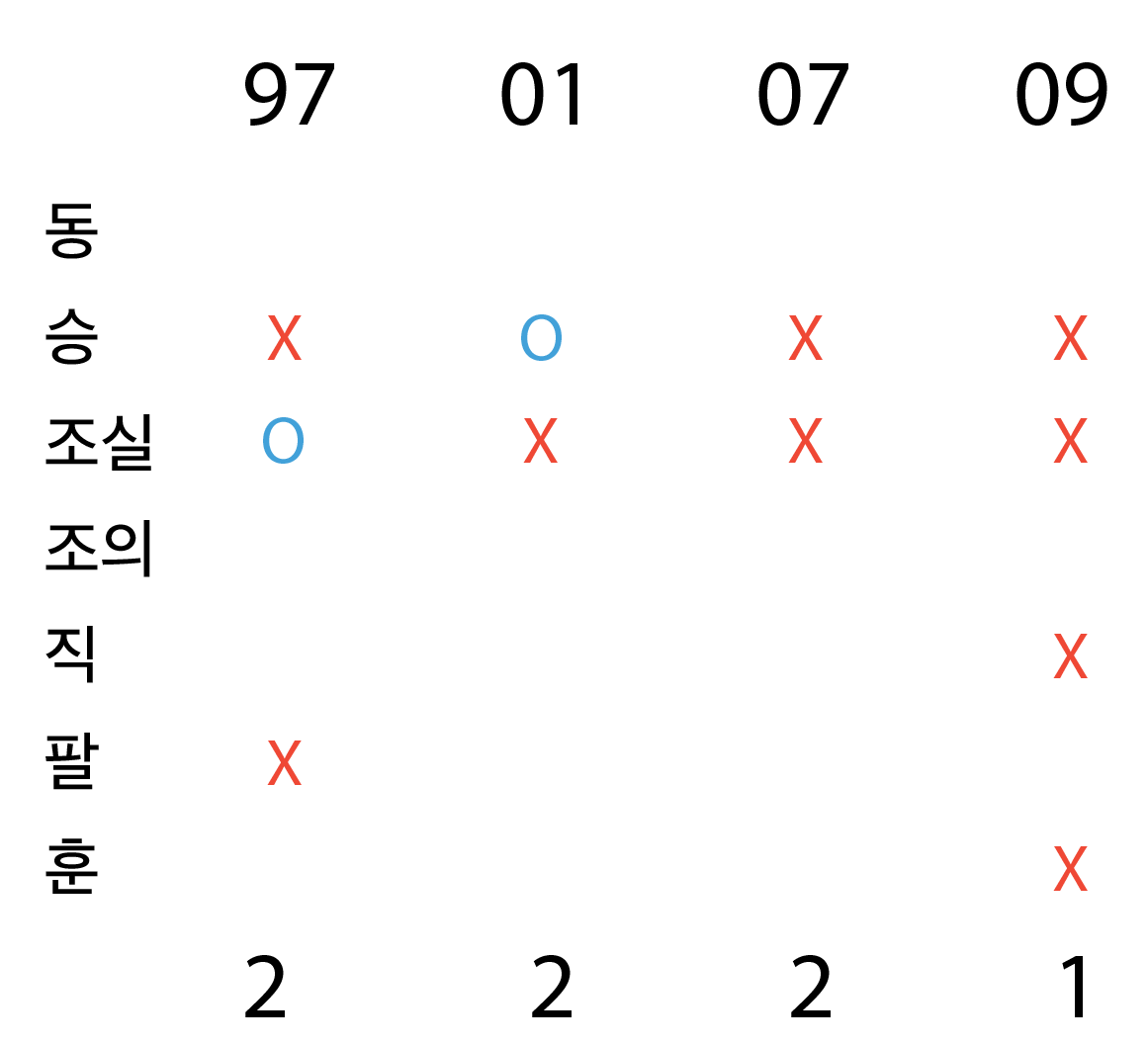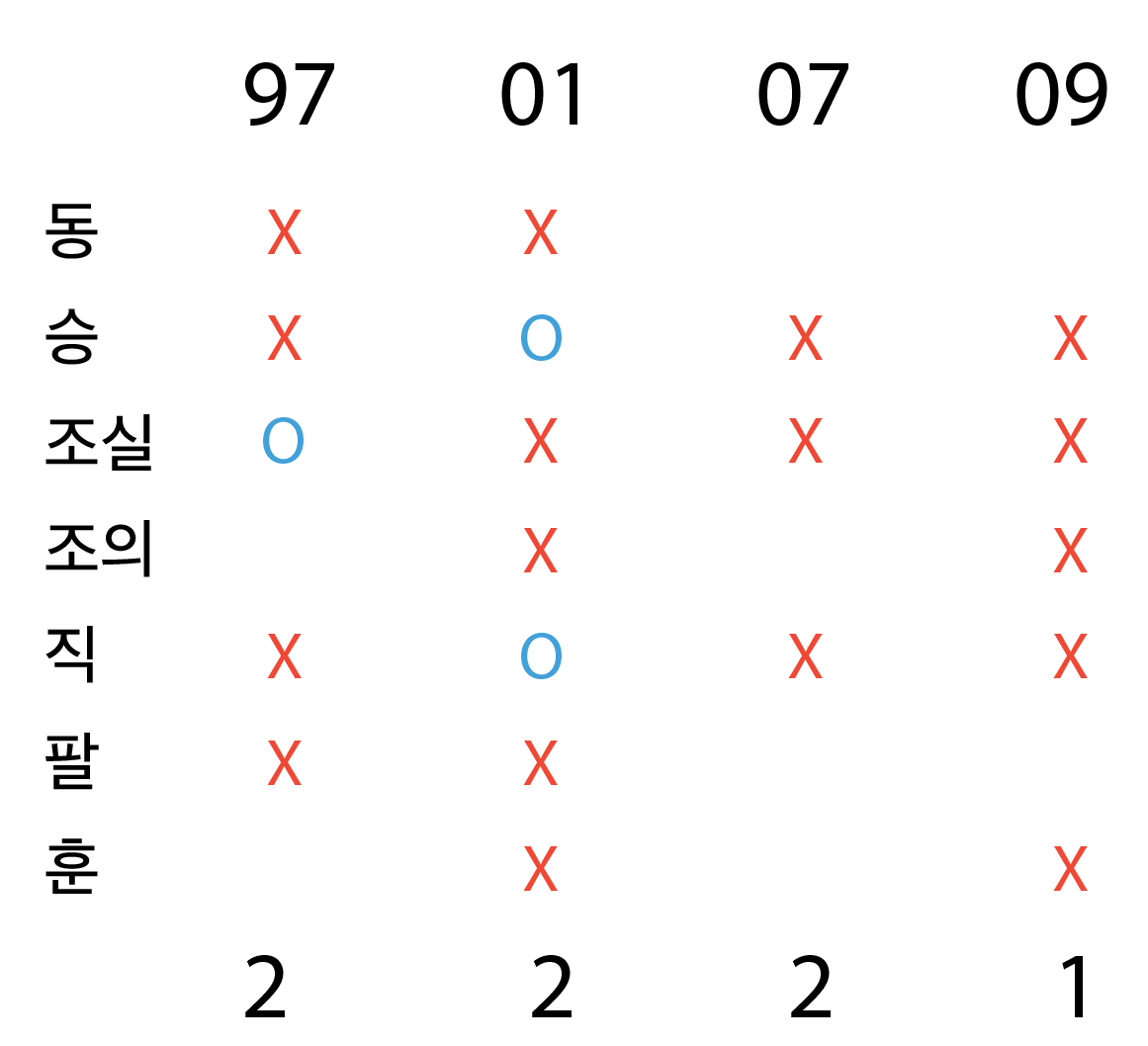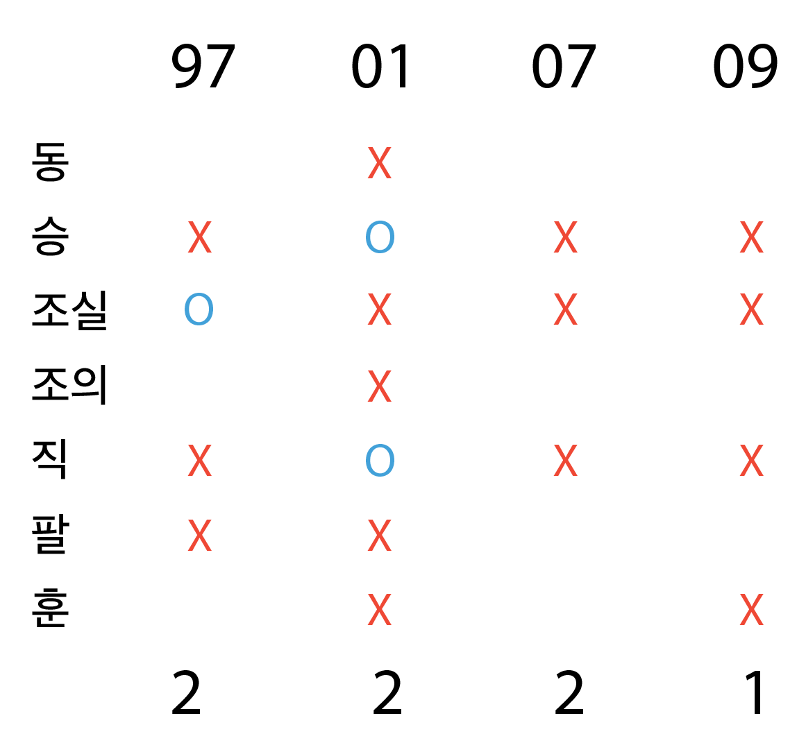 이를 통해 10년도에는 지정된 게 없고, 위 4개 연도만 고려하면 됨을 알 수 있다 .